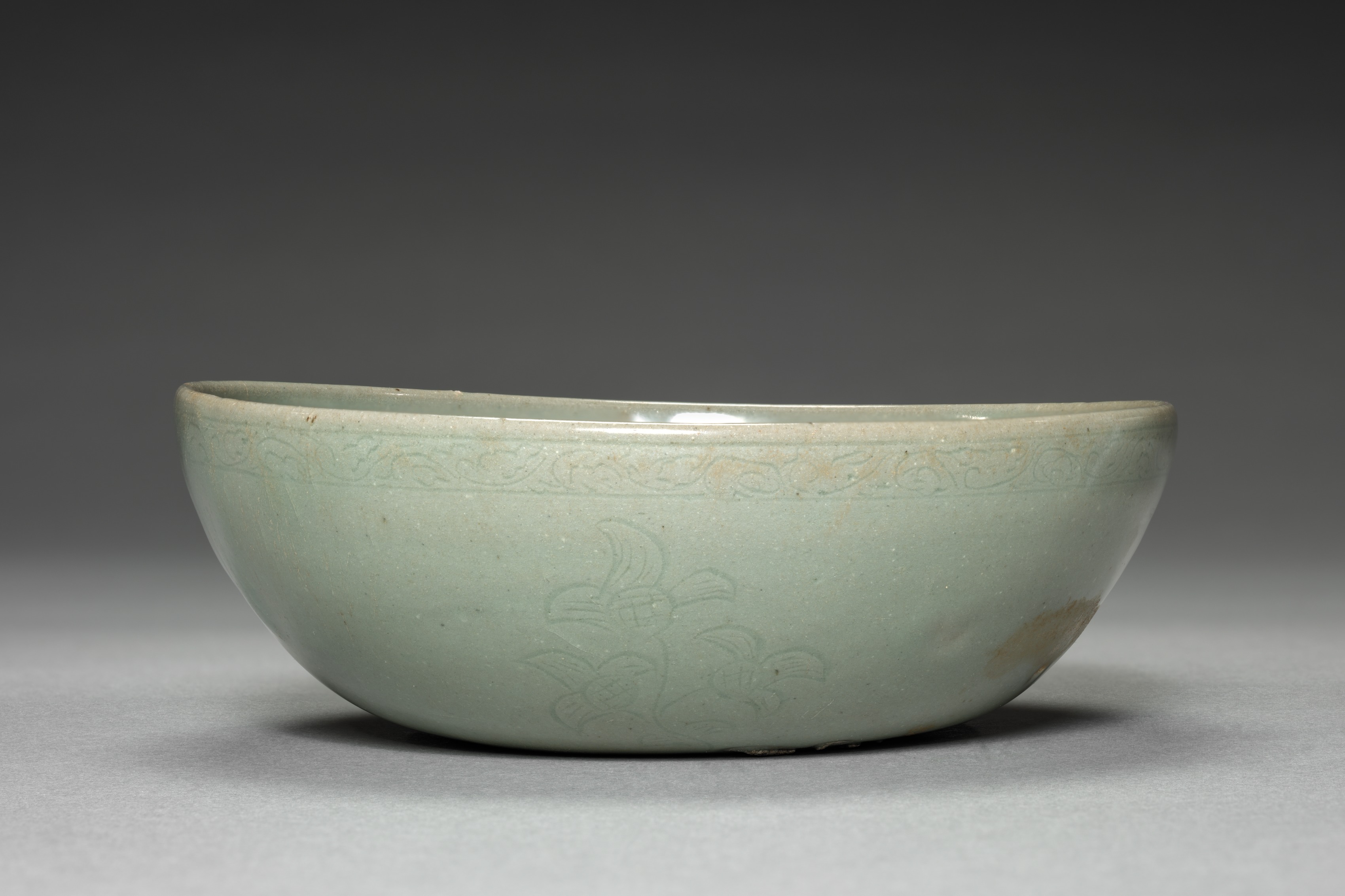 The dish has a light greenish-gray color. The bowl is rounded with a wide mouth and a narrow base. The exterior has an incised floral design. The design is faint and difficult to see. The interior appears smooth. A darker spot is on the lower right side. The background is dark gray and light grey. The Dish with Incised Floral Design by an unknown artist.