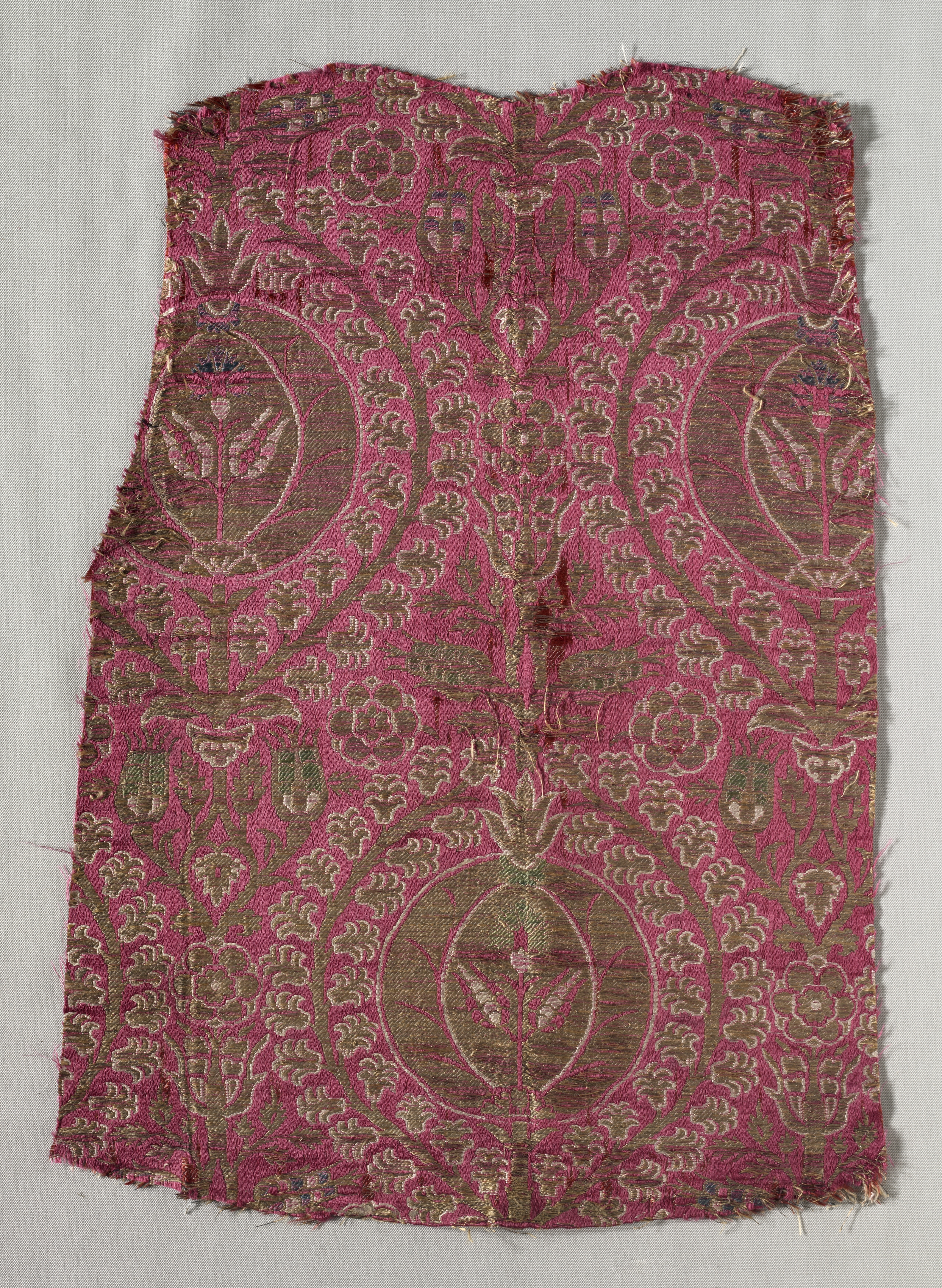 The image shows a piece of fabric titled "Fragment" by an unknown artist. The fabric is pink with a floral pattern in shades of brown, gold, and green. The fabric appears to be a textile fragment, possibly from a larger piece of clothing or upholstery. The edges of the fabric are frayed and rough, with some threads hanging loose. The fabric is rectangular in shape, with a slightly curved top edge. The background of the image is a light gray color, which helps to highlight the details of the fabric. The fabric has a repeating pattern of flowers and leaves in a circular design. The circular designs are arranged in a grid-like pattern across the fabric. The colors of the fabric are muted, with the pink being the dominant color. The brown and gold colors are used for the floral patterns, while the green is used for accents. The fabric appears to be made of a thick, woven material. The overall appearance of the fabric suggests that it may be an antique or vintage piece.