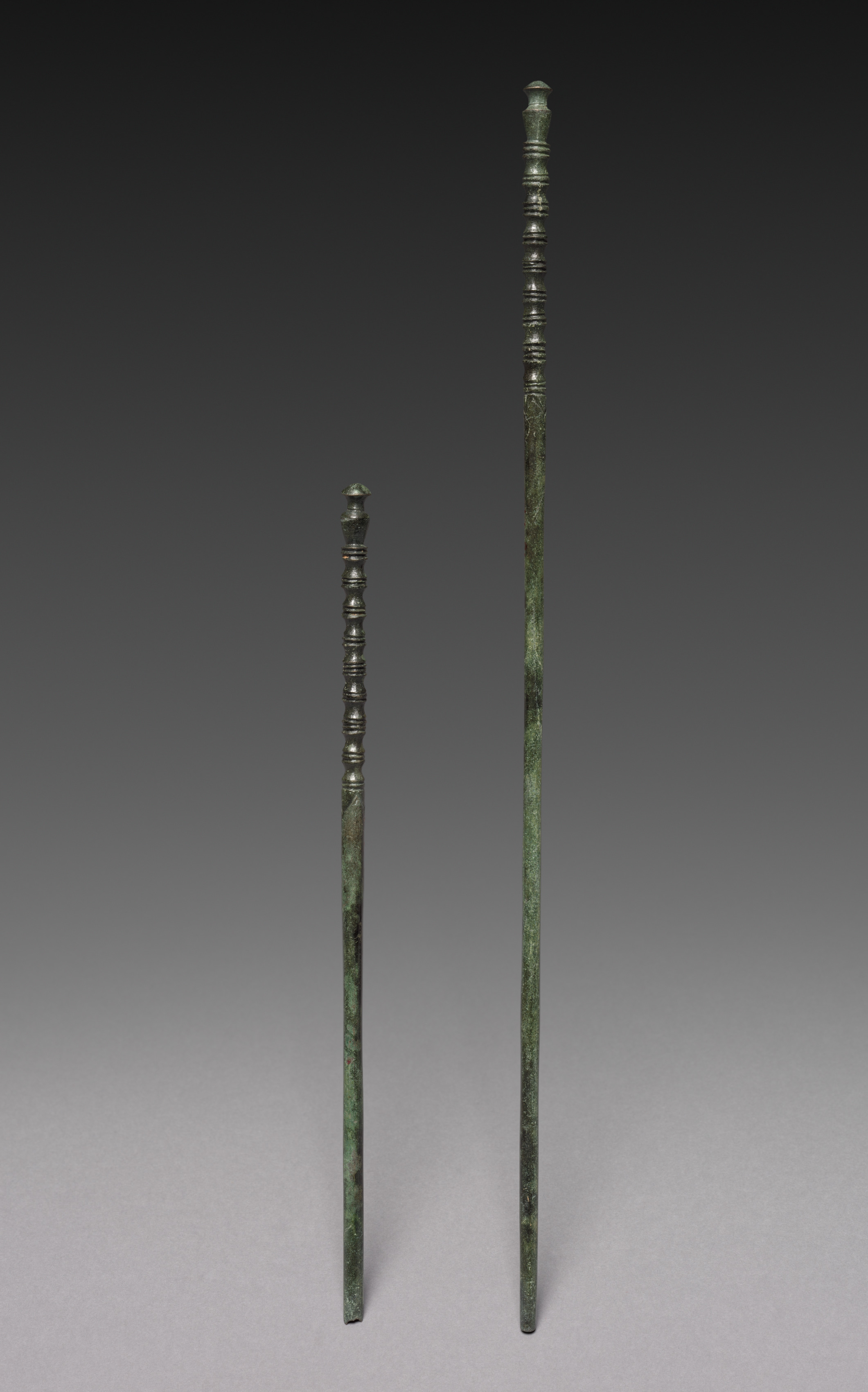 The image shows a pair of long, thin metal chopsticks with a greenish patina. The chopsticks, titled "Pair of Chopsticks," are made by an unknown artist. They have a dark green color with some lighter green and black spots. The chopsticks are standing upright. The one on the right is longer than the one on the left. Both have a series of small, raised rings around the top portion. The background is a gradient from dark gray at the top to light gray at the bottom. The chopsticks cast a slight shadow on the surface they are standing on.
