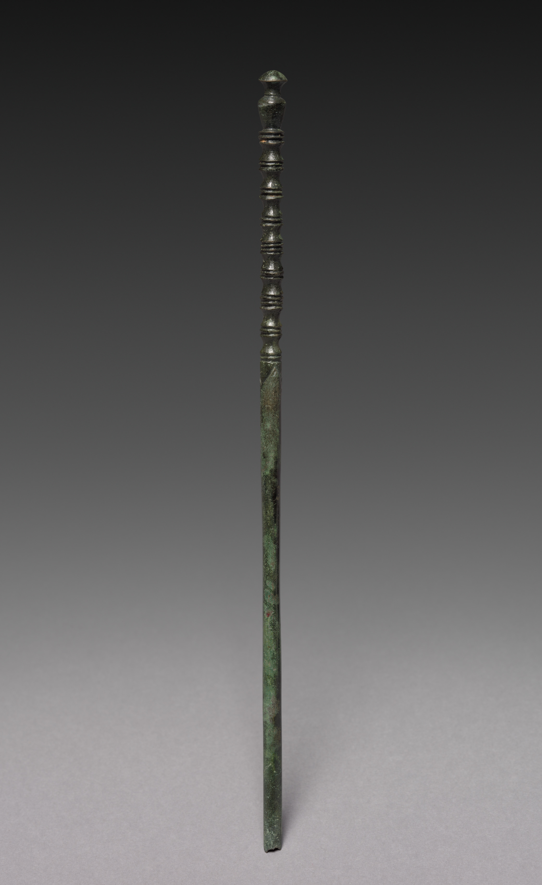 The image shows a long, thin object titled "Chopstick" by an unknown artist. The object is made of dark green metal, possibly bronze or copper, with visible signs of aging and wear. It has a rounded knob at the top and a series of raised rings below it. The object tapers down to a point at the bottom. The background is a gradient from dark gray at the top to light gray at the bottom. The object casts a small shadow on the surface below it.