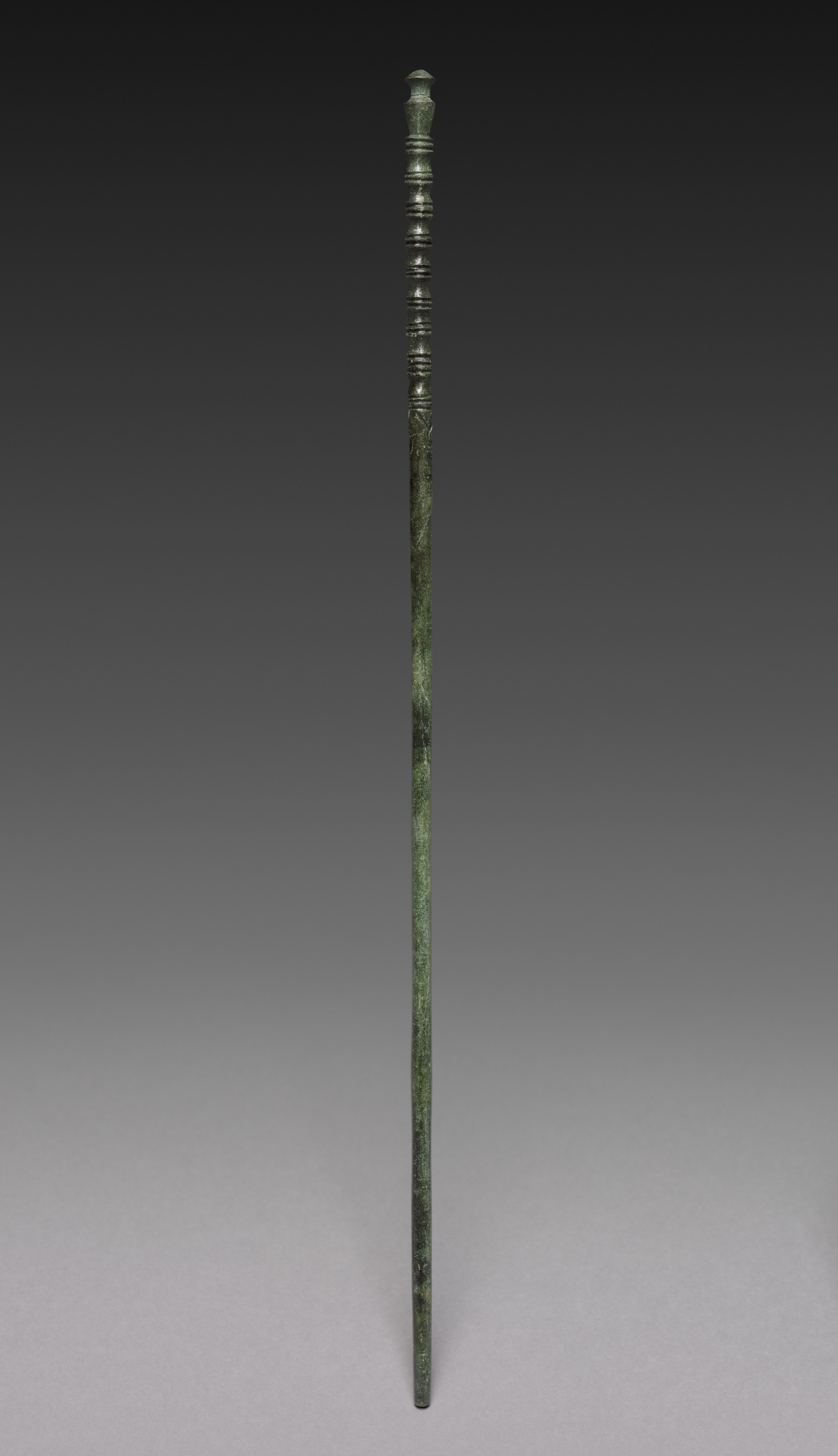 The image shows a long, thin, green metal object, Chopstick by artist not provided. The object is standing vertically. The top is rounded and features a series of stacked, rounded ridges. The majority of the object is smooth and cylindrical. The object has a dark green patina with lighter green and brown spots. The background is a gradient from dark gray at the top to light gray at the bottom.