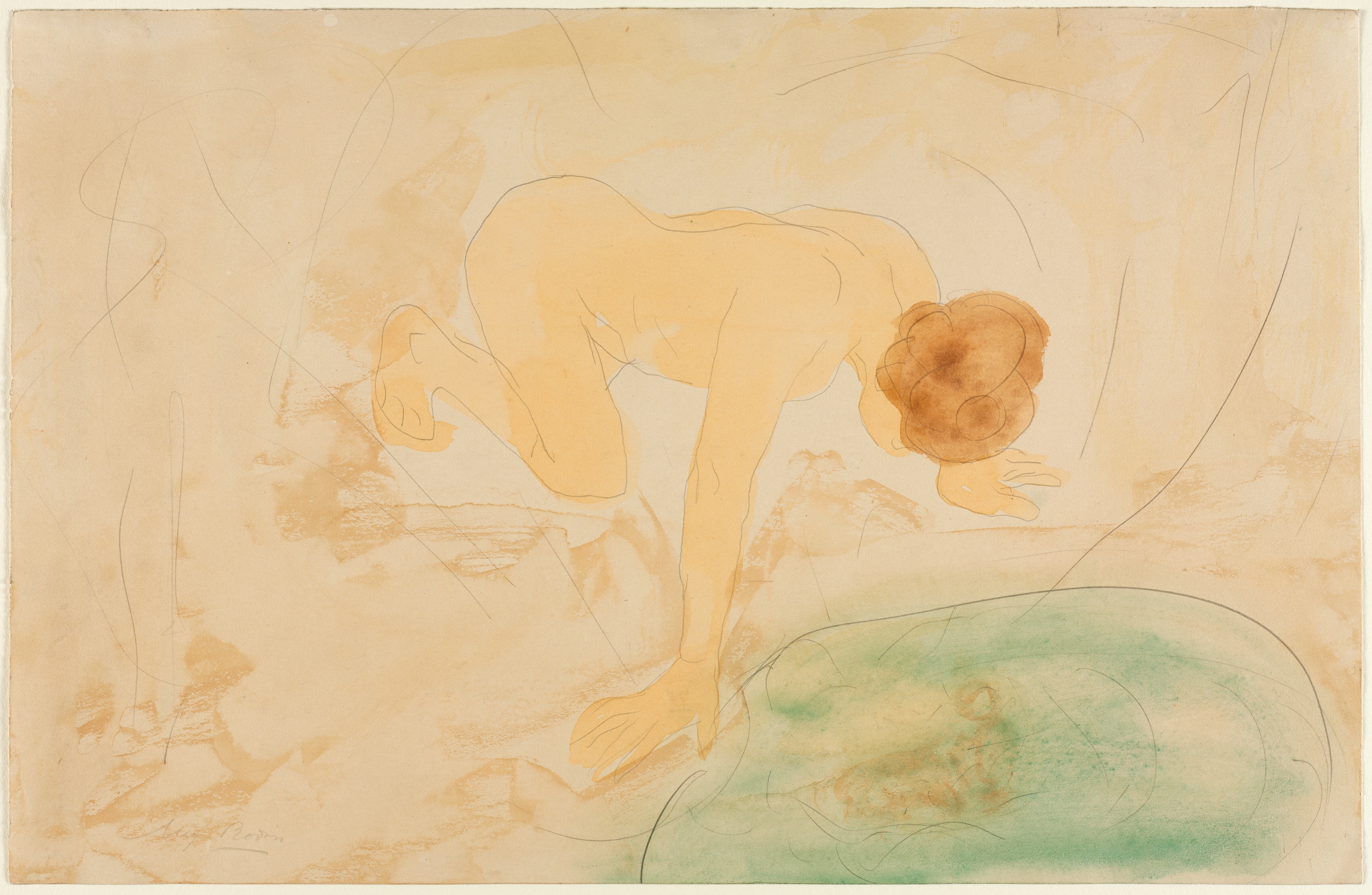 The Reflection by Hand B, artist Auguste Rodin: A nude woman bending down with her head to the right, positioned on all fours. Her hair is brown. The background is a mottled beige color with scattered darker lines throughout. A green blob-like shape is at the bottom right corner.