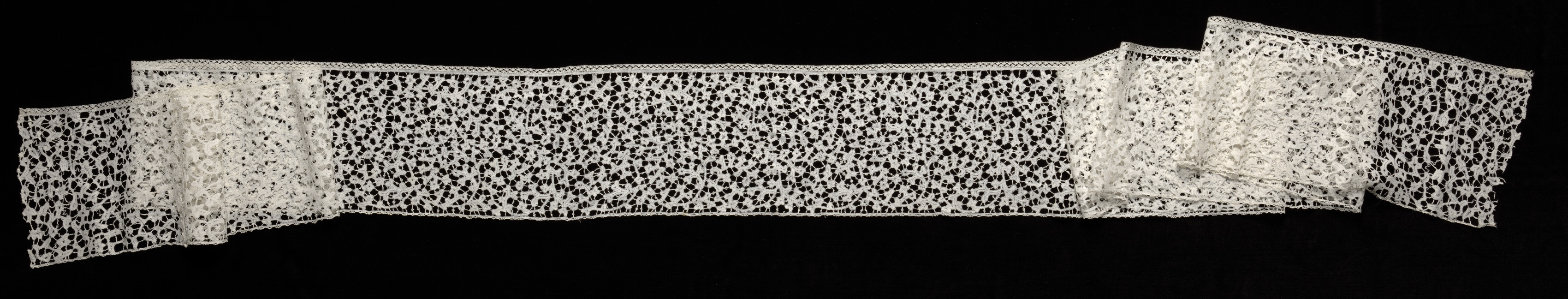 White bobbin lace flounce with a repeating pattern of small flowers or florals, formed by numerous tiny holes and delicate white threads; flounce widest in center and tapering on either side; appears to be irregularly shaped with rippling effect; background is solid black. Bobbin Lace (Punto di Milano) Flounce.