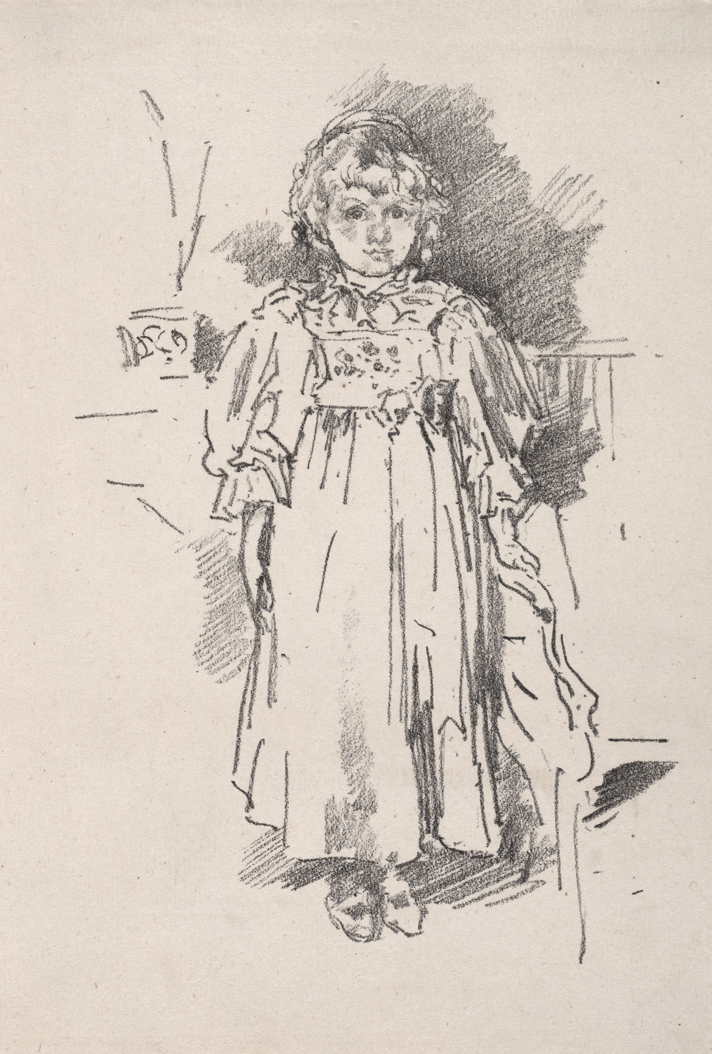 Black and white sketch of a young girl in a dress. The girl has curly hair and is wearing a long dress with puffy sleeves. She has both arms down by her sides. Her right leg is crossed in front of her left. A table with a cup on it is behind her on the left. A chair is behind her on the right. The background is shaded. The girl's dress has a lace collar and there are shadows on the floor. The overall drawing is simple and appears to be a quick sketch. Little Evelyn by James McNeill Whistler.