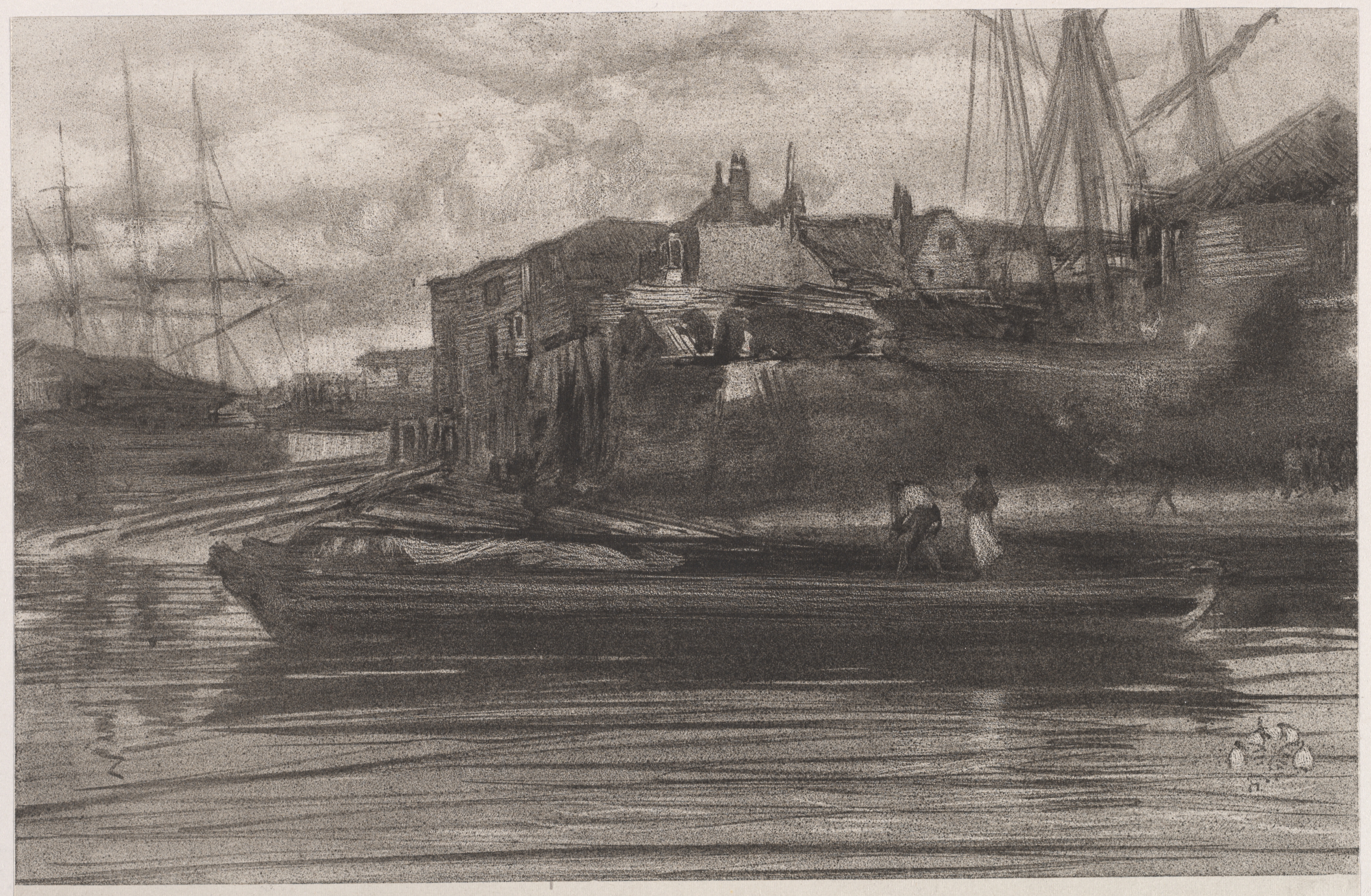 The image depicts a black and white scene of a harbor. A boat with two people is in the foreground, and there are several buildings and docks in the background. There are several large ships on the left side of the image. The sky is cloudy. The image appears to be a drawing or etching, with a stippled texture. It is titled "Limehouse" and is by James McNeill Whistler.