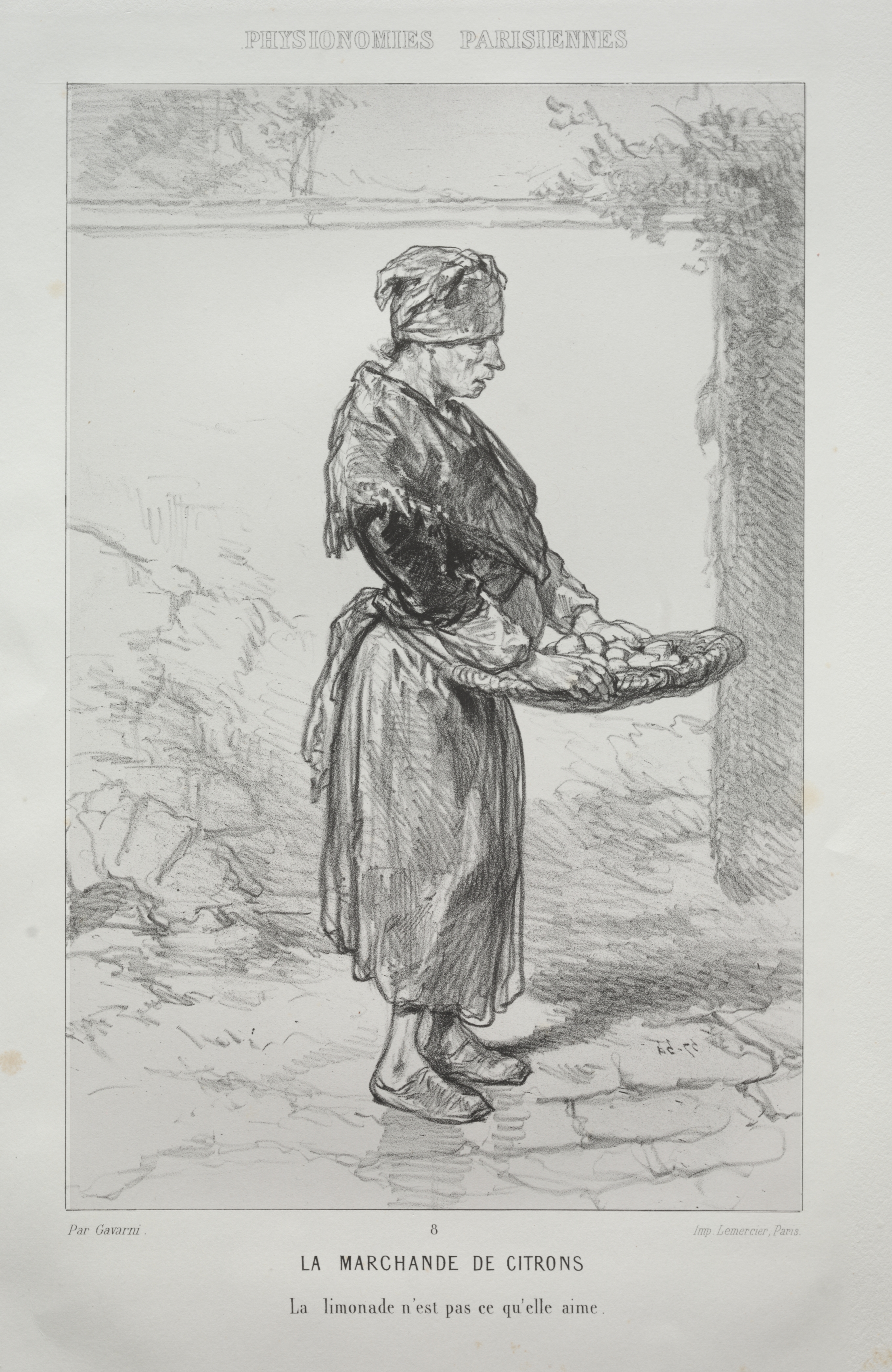 Black and white drawing of a woman wearing a long dress and head covering, holding a tray of lemons. The woman is standing on cobblestone, facing right. She wears a long skirt and a shawl or apron over a dark bodice. Her head covering is tied back. The background shows a wall on the right with foliage and a low wall or ledge at the top with foliage and trees. Text at the top reads "Physiologies Parisiennes". Under the drawing, the text reads "La Marchande de Citrons" and "La limonade n'est pas ce qu'elle aime".
