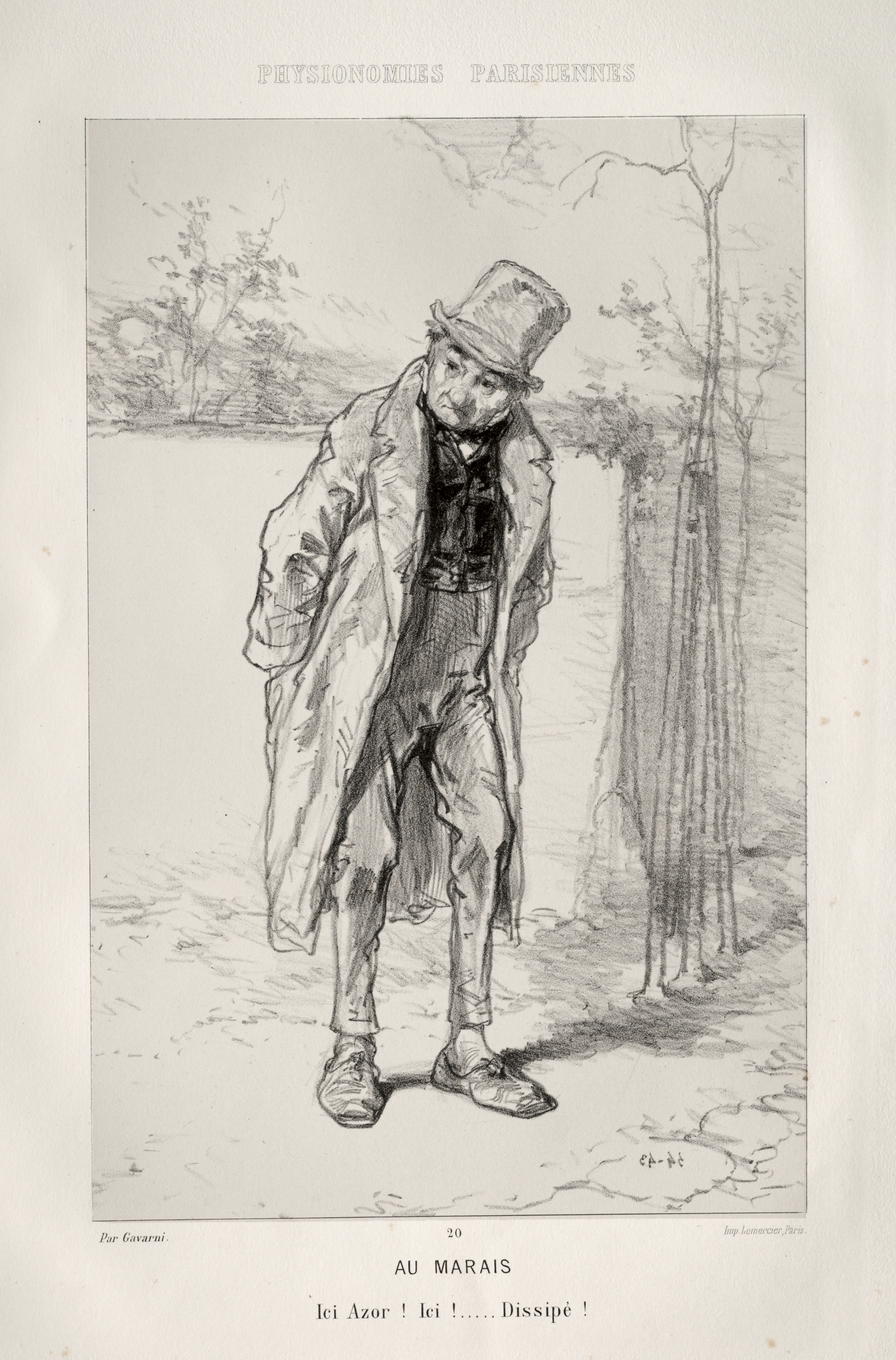 Black and white drawing of a man in a top hat and long coat standing on a dirt path, looking dejected. He wears a vest and pants with suspenders. His right arm appears tucked into his coat. Thin trees and foliage are in the background. Text at the top reads "physiologies parisiennes". At the bottom, text reads "au marais" and some exclamations below that.