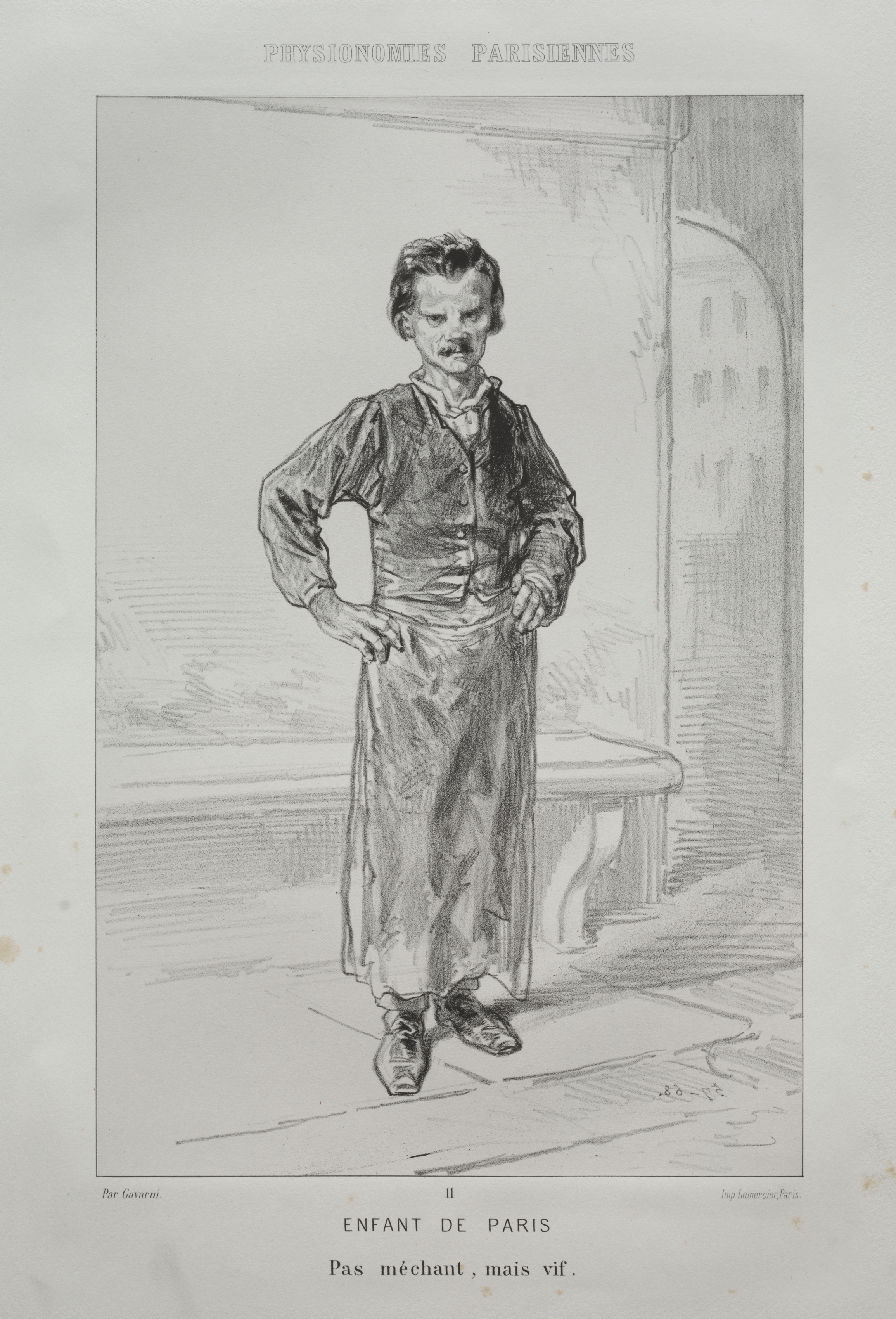 Black and white drawing of a young boy. He stands facing the viewer with both hands resting on his hips. He has short dark hair. He wears a loose long-sleeved shirt with billowy sleeves and a high neck. His pants are loose-fitting and extend to his ankles. He wears shoes with laces. Text at the top of the image reads "physiologies parisiennes". The background contains a bench and building, a wall and flooring. Text at the bottom of the image reads "Enfant de Paris" and "Pas mechant, mais vif". Artist Paul Gavarni.