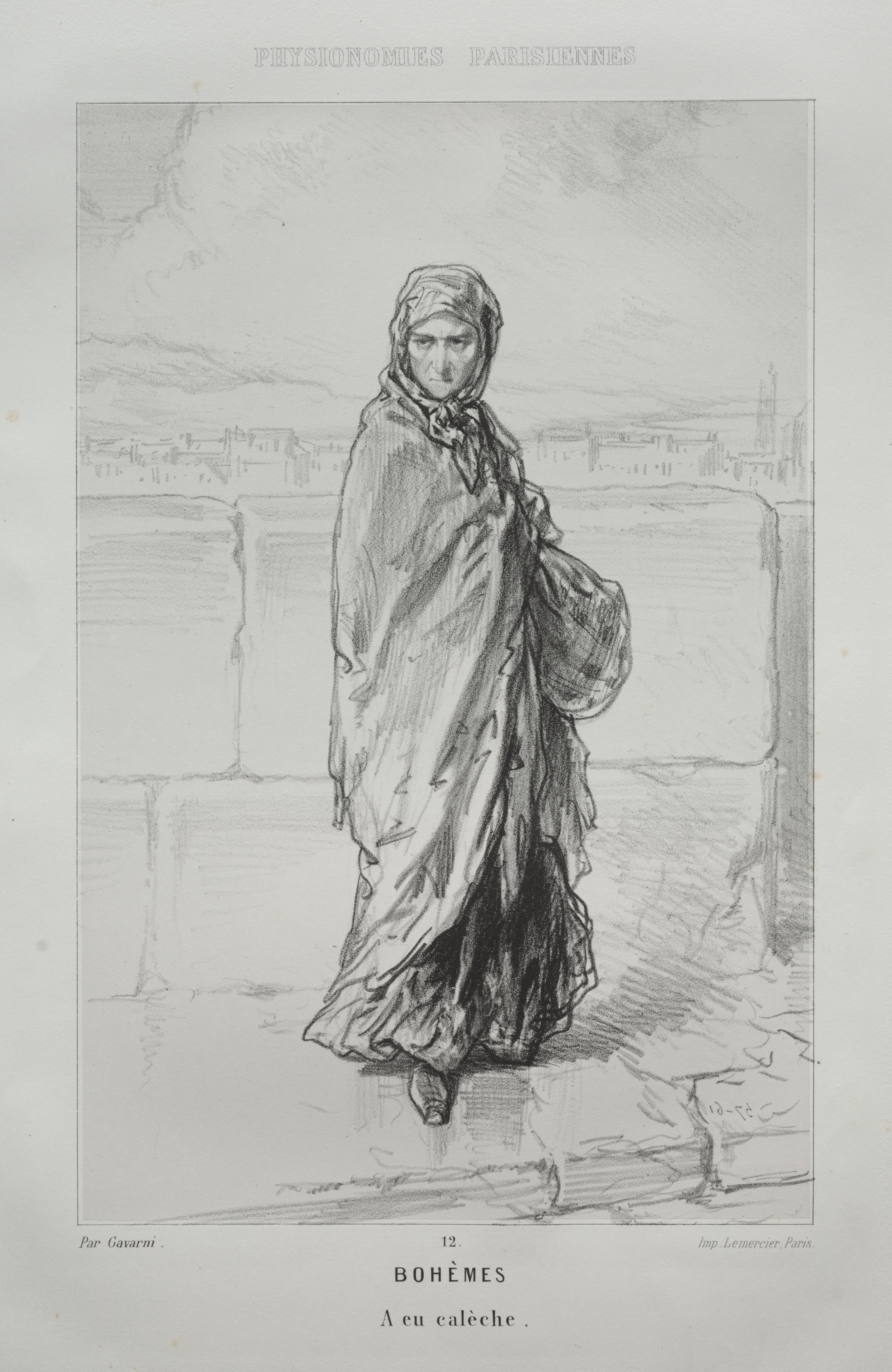 Black and white drawing of a woman in a long dress walking. The woman faces viewer with her body angled to the right; her head is covered by a headscarf. She wears a long dress with a shawl or coat over it. Her left arm is bent at the elbow with her hand under the shawl or coat. A city skyline with buildings and a cloudy sky are in the background. The illustration is titled "BOHEMES" and subtitled "A eu caleeche" in black text below the image.