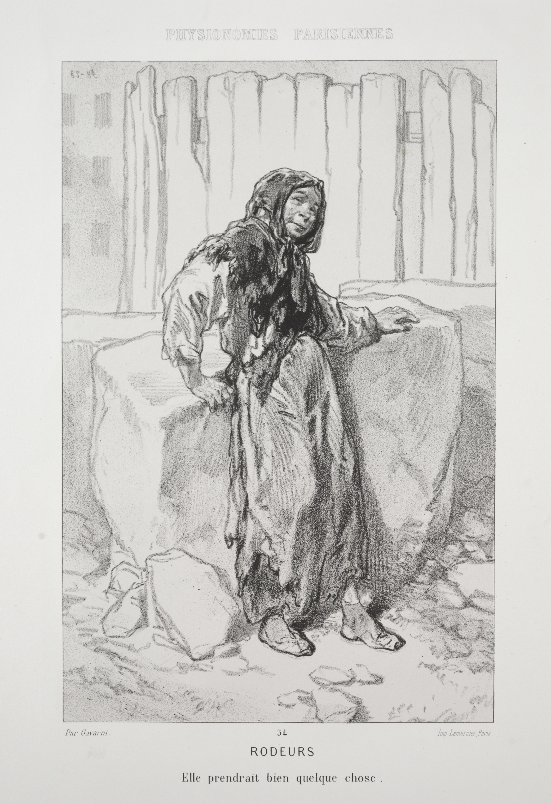 The image depicts a black-and-white drawing of a woman sitting on a stone or concrete block. She has long hair and is wearing a long dress. Her right hand rests on the block beside her, and her left hand is on her knee. The woman's face is dirty. The block she sits on appears to be in a city setting, with a wooden fence behind her and a building to her left. The ground around her is littered with rocks or stones. The title "Rodeurs" and the artist's name, Paul Gavarni, are written at the bottom of the image.