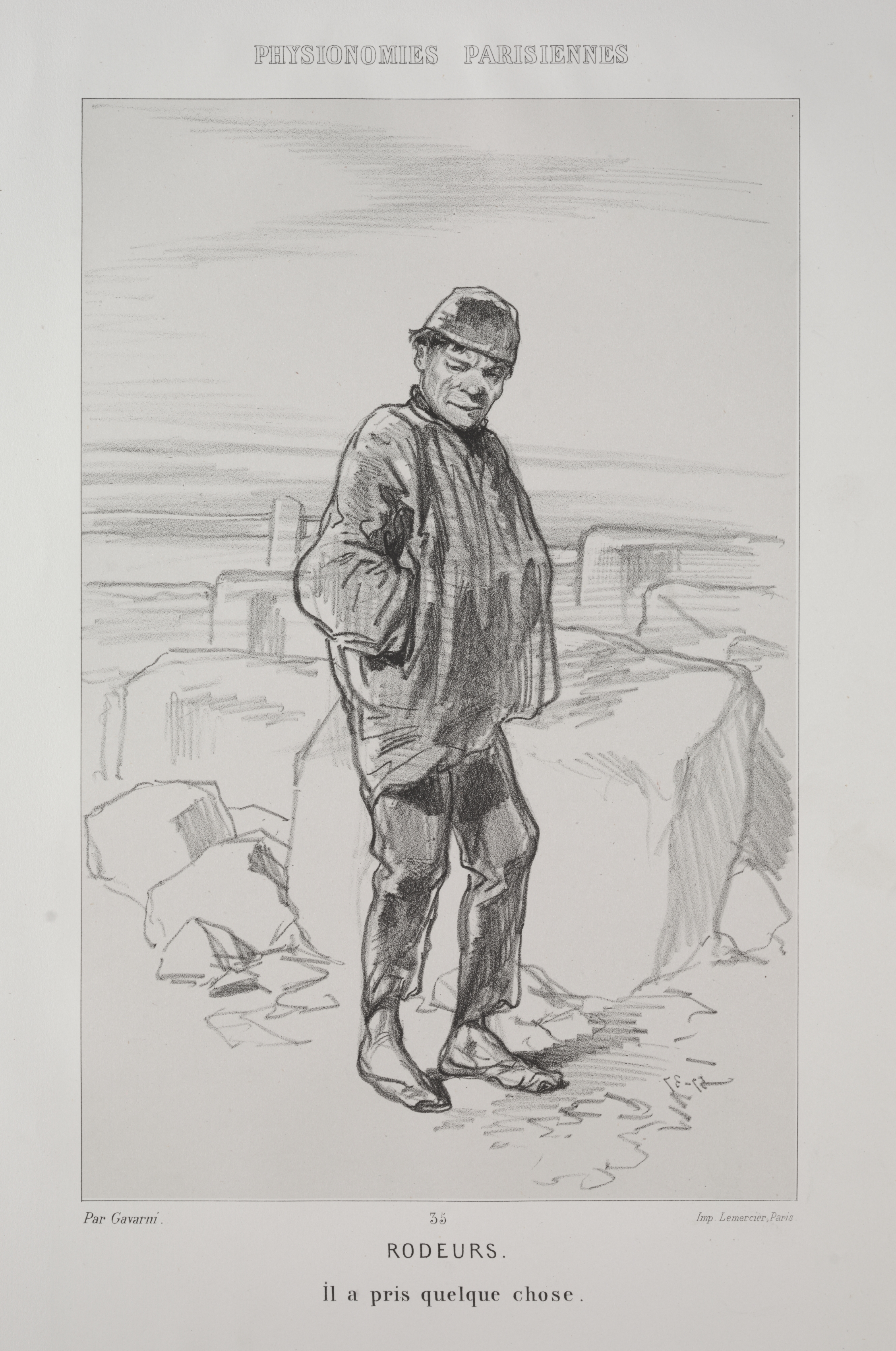 Black and white drawing of a man standing on a street. The man is wearing a flat cap, a long jacket with sleeves that bunch up at the elbow, trousers and low shoes. The man has his right arm slightly bent at the elbow with the hand in the jacket pocket. His left arm hangs loosely by his side. The man looks downwards to the right with a frowning expression on his face. The background shows a pile of rubble on the ground behind the man to the left and a low wall behind him to the right. There are buildings in the background. The image has text at the top that reads "Physionomies Parisiennes". The image has text below that reads "Rodeurs" and "Il a pris quelque chose".