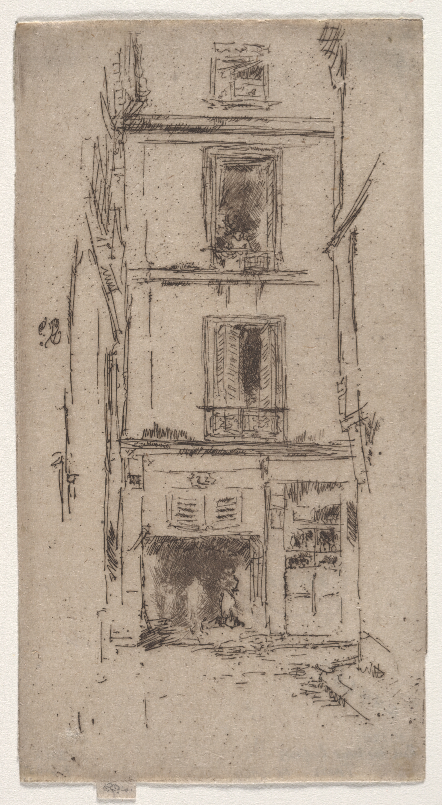A sketch of a three-story building with a storefront on the bottom floor. The bottom floor has a large opening with a person standing inside, and two windows on either side. The middle floor has one large window with its shutters open. The top floor has a small window. The building appears to be made of stone or brick and has a flat roof. The sketch is drawn in dark brown ink on a light brown paper. The lines are rough and uneven. A small piece of paper is attached to the bottom. The background behind the paper is white.