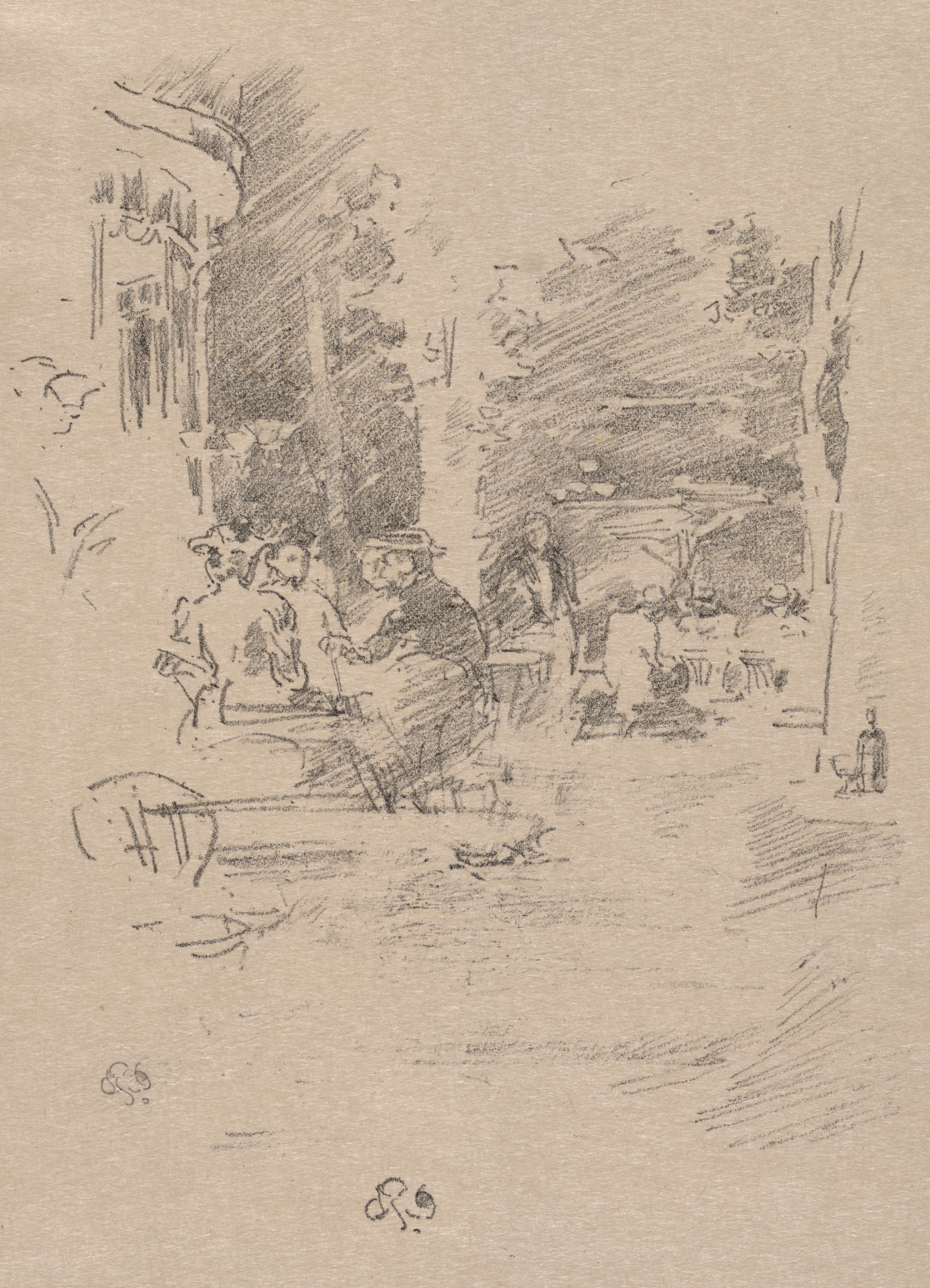 The image depicts a sketch of a café scene. A large building with a door and windows is on the left. People are seated at tables outside the building under an awning or roof. The tables and chairs are small. Some people are sitting and some are standing. A man is sitting at a table on the left side, facing right. He is wearing a hat. There are trees on the right side. A person is standing on the right side with what appears to be a dog on a leash. The sketch is done in pencil on tan paper. The style is impressionistic with loose lines and shading.