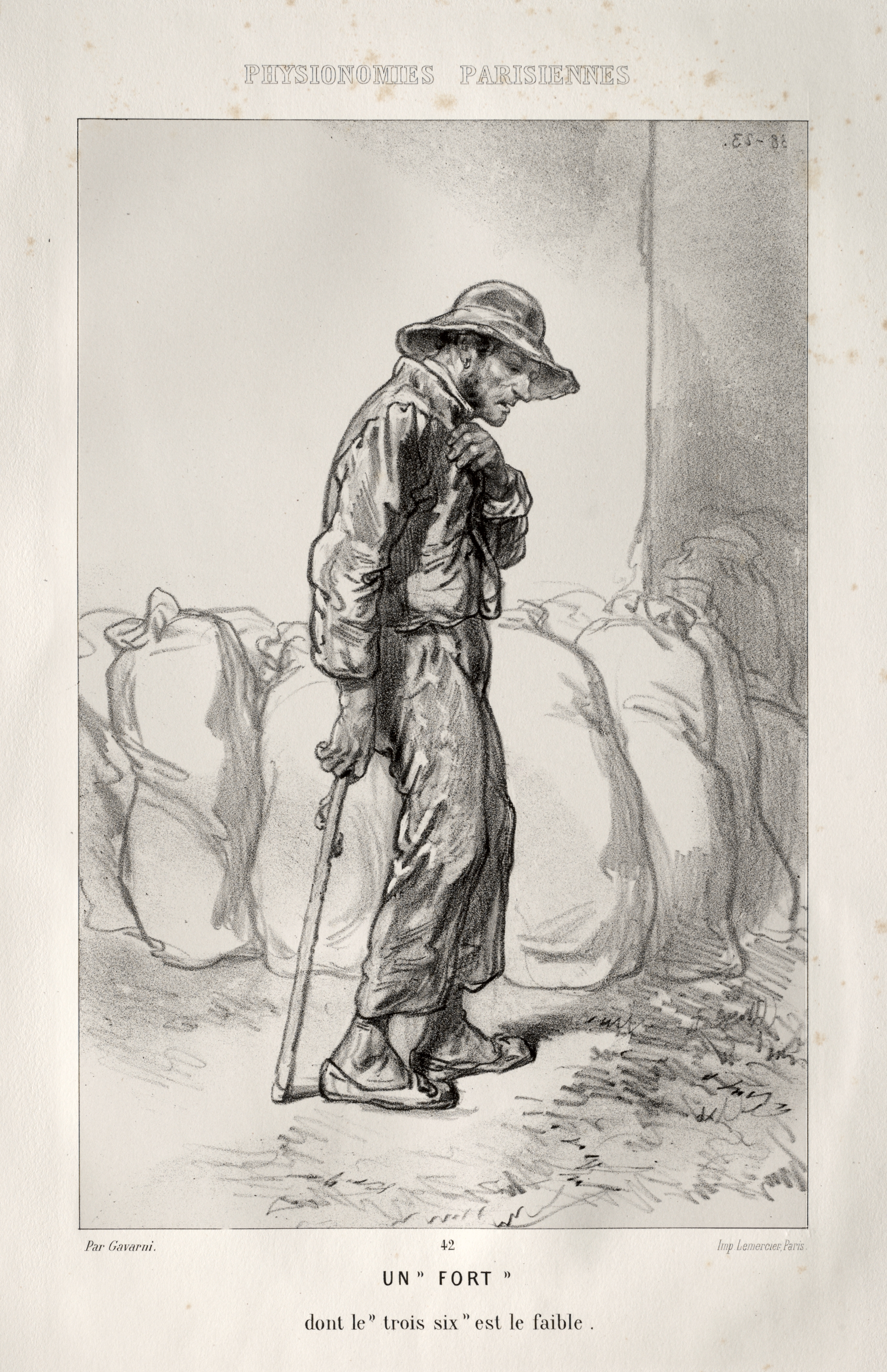 Black and white drawing of a man in a hat and casual clothing, with a cane in one hand, standing in profile view facing right. The man is positioned in front of several large sacks. He appears to be slouching and looking down. He wears a wide-brimmed hat, a long-sleeved shirt, pants, and shoes. The image is framed by a thin border with text at the top that reads "Physiologies Parisiennes". At the bottom of the image, the text reads "Un Fort" and "dont le trois six est le faible."