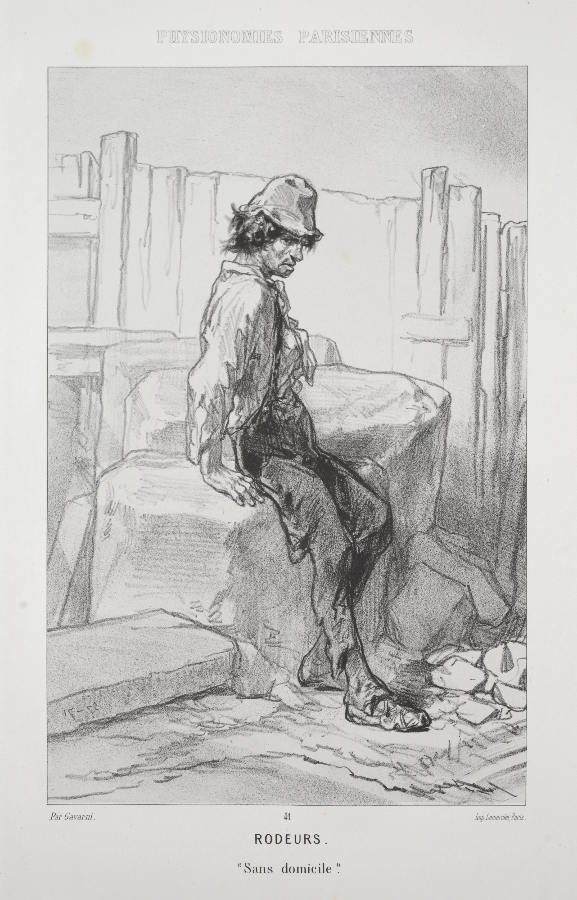 Black and white drawing of a man sitting on a stone bench. He wears a hat, a collared shirt, and pants. The man sits with his left hand on the bench and his right hand on his knee, looking down. He has dark hair. The background shows a wooden fence. Text at the top reads "physiologies parisiennes". At the bottom, the text reads "Rodeurs" and "'Sans domicile'".