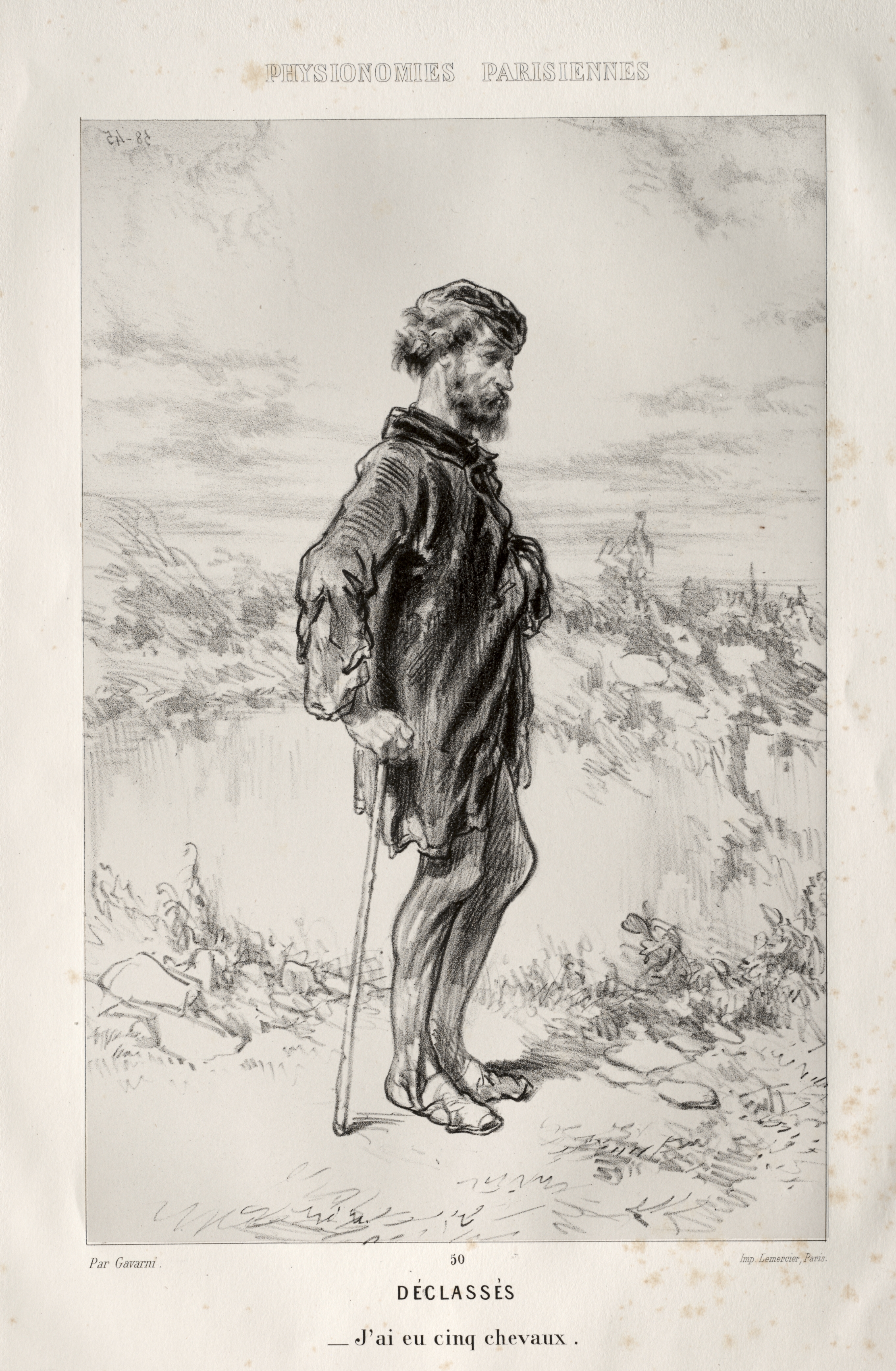 Black and white drawing of a man standing on a dirt path. The man is wearing a dark jacket, no shoes, and a hat. He has a cane in his right hand. He is turned so his body faces left and his head faces right. He looks over his right shoulder. He has a full beard and short hair under his hat. The background depicts a cloudy sky and a body of water. Text at the top reads "physiologies parisiennes." Text below the drawing reads "DECLASSÉS" and underneath that "-j'ai eu cinq chevaux."