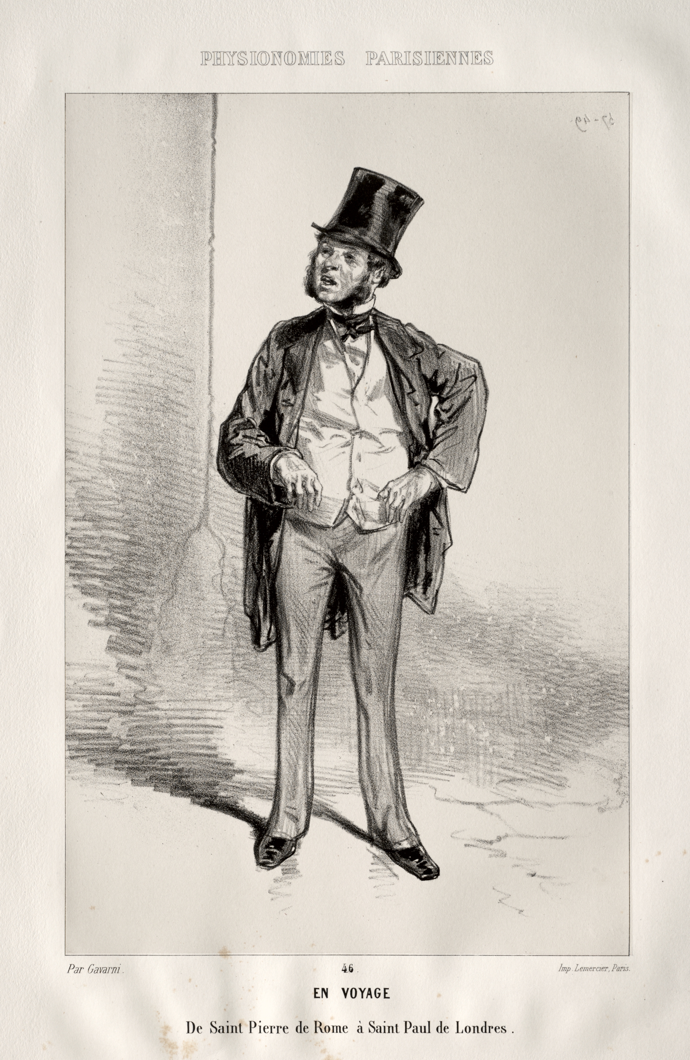 Black and white drawing of a man in a top hat, light-colored vest, white shirt, bow tie, light pants, and long dark jacket. His right hand is in his pocket, and his left hand is on his stomach. He stands with his head turned to the left and mouth open as if speaking. He wears shiny black shoes. The background includes shading suggestive of a wall to the left and a floor. Text at the top reads "Physiologies Parisiennes", and at the bottom "46 En Voyage. De Saint Pierre de Rome à Saint Paul de Londres."