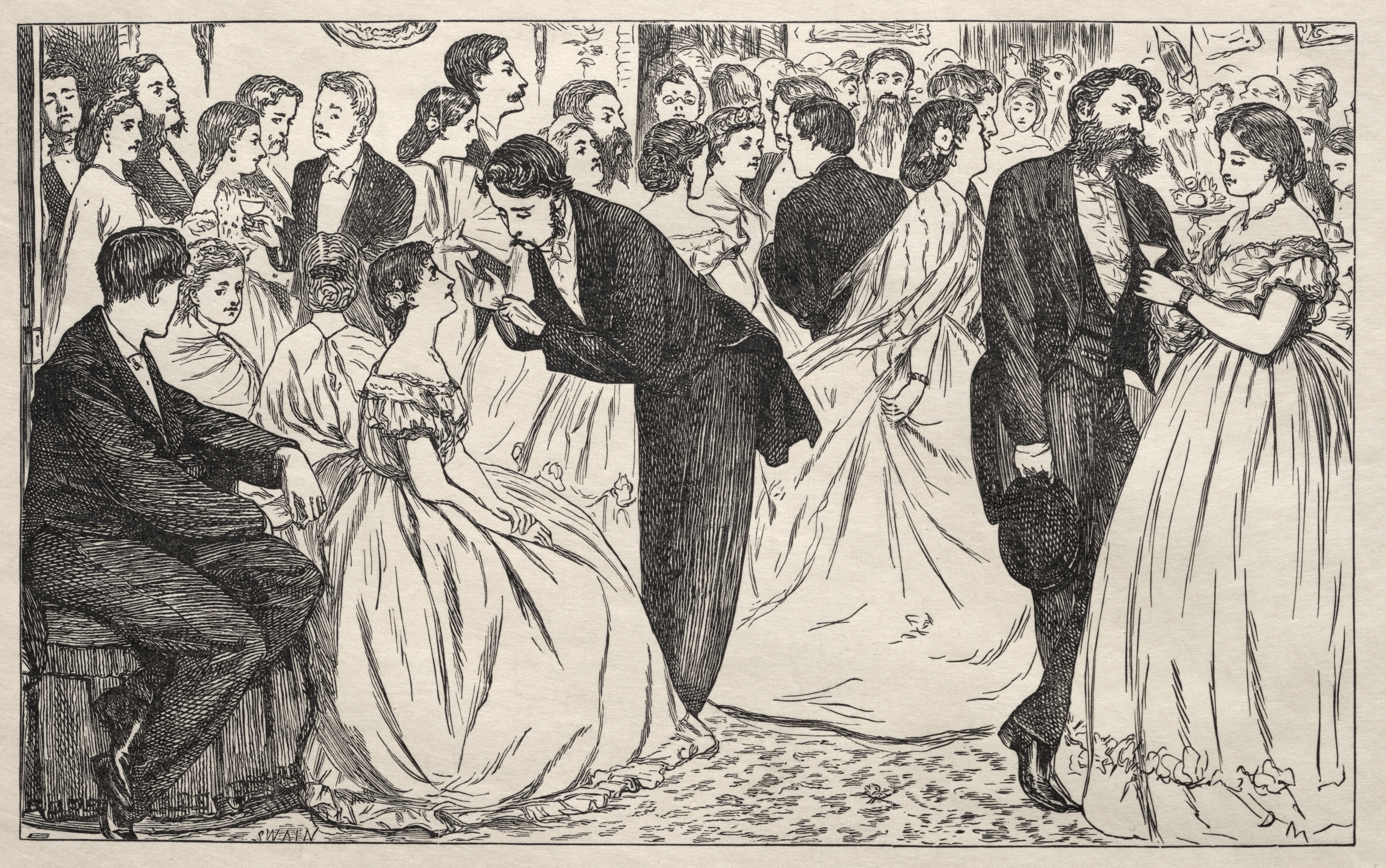 Black and white drawing of a crowded room. A man wearing a tailcoat bends at the waist with one arm extended towards a seated woman wearing an off-the-shoulder dress. A man wearing a three-piece suit and top hat stands to the right of the woman. A man sits to her left on a chair playing an instrument. Many men and women in formal clothes fill the room.