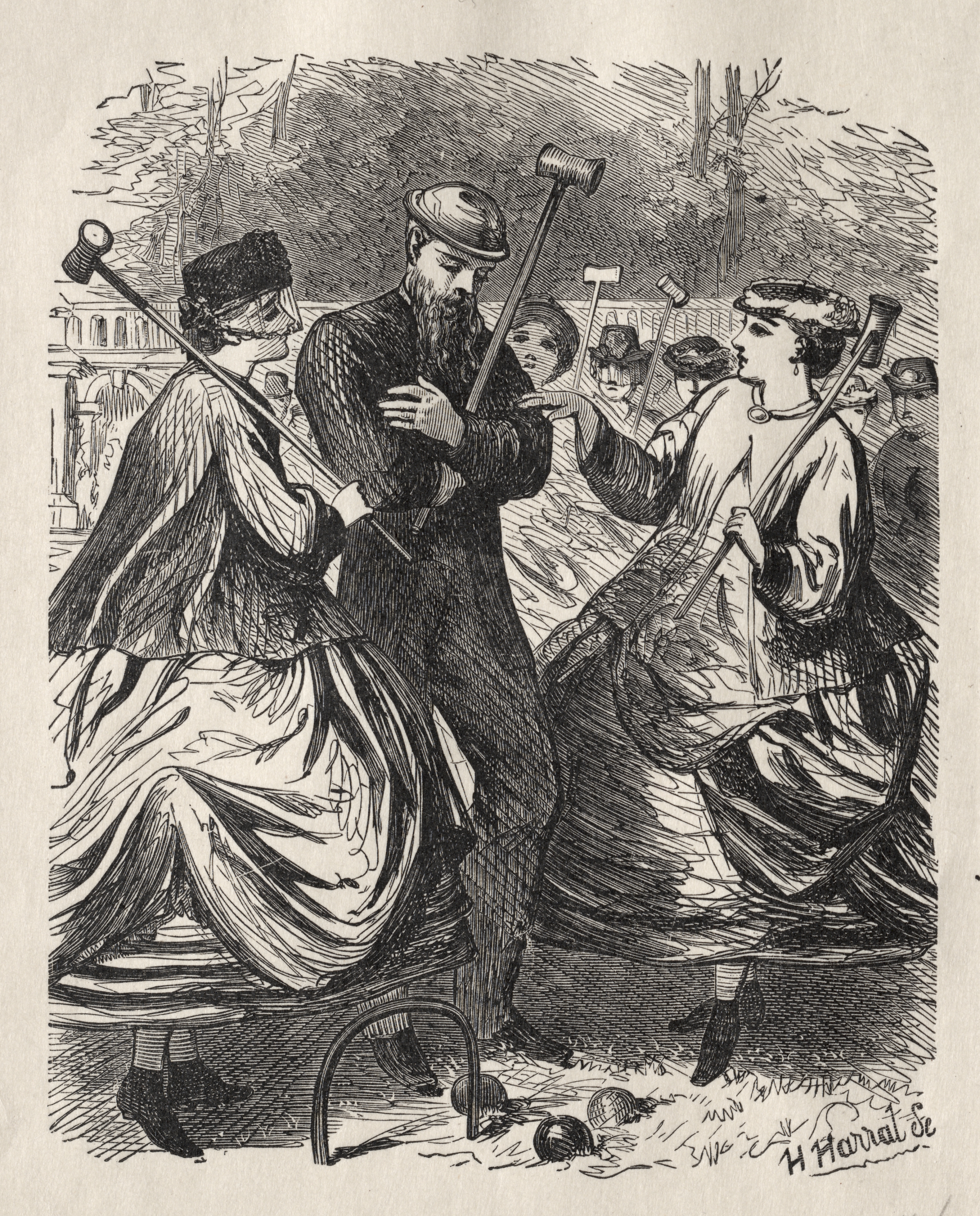 Black and white drawing of a group of people playing croquet. A man stands between two women, the woman on the far side has a mace slung over her shoulder, she faces left. A man and woman on the right both hold maces and look at one another. The man closest to the foreground holds a mace and has a large beard. Three croquet balls and a wicket are on the ground. Other people are playing in the background. The people all wear Victorian clothing.
