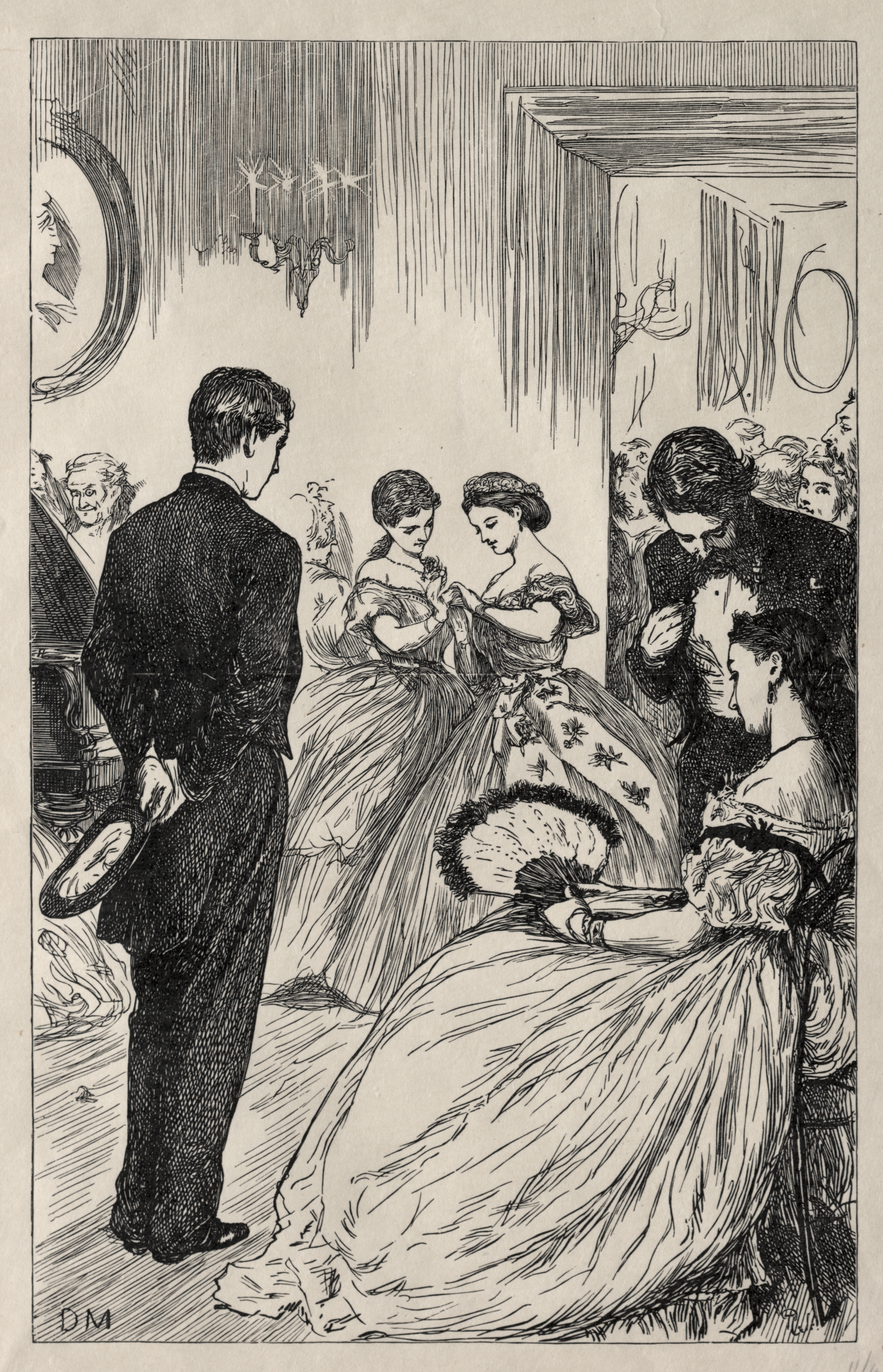 Black and white drawing of a scene in a Victorian-era room. A man in a black suit and top hat stands facing away from the viewer. He looks at a woman sitting on the right, who wears a dress and holds a fan. Two women in dresses stand in center, one holds a teacup. A man stands behind them. A woman and man sit at a table on the left edge. The room has a chandelier, and a mirror on the wall. The drawing is signed "DM" in the bottom left corner.