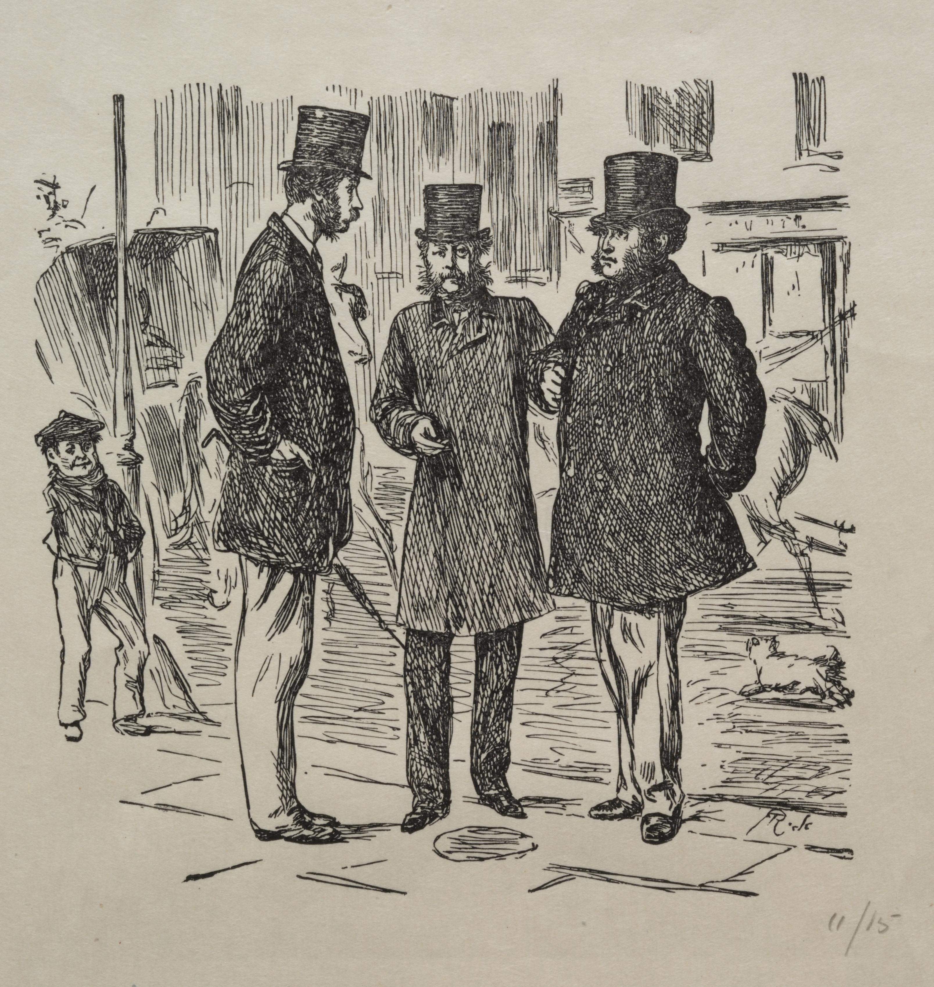 Black and white drawing of three men in top hats standing on a street, engaged in conversation. The man on the left has his hands in his pockets, the central figure has one hand in his pocket and the other raised near his mouth, and the man on the right has one hand behind his back. The three men are wearing long coats and light-colored pants. A young boy on the left is holding a long stick. There are buildings in the background. The image has a signature in the bottom right corner. The scene depicts a casual gathering of men on a city street.