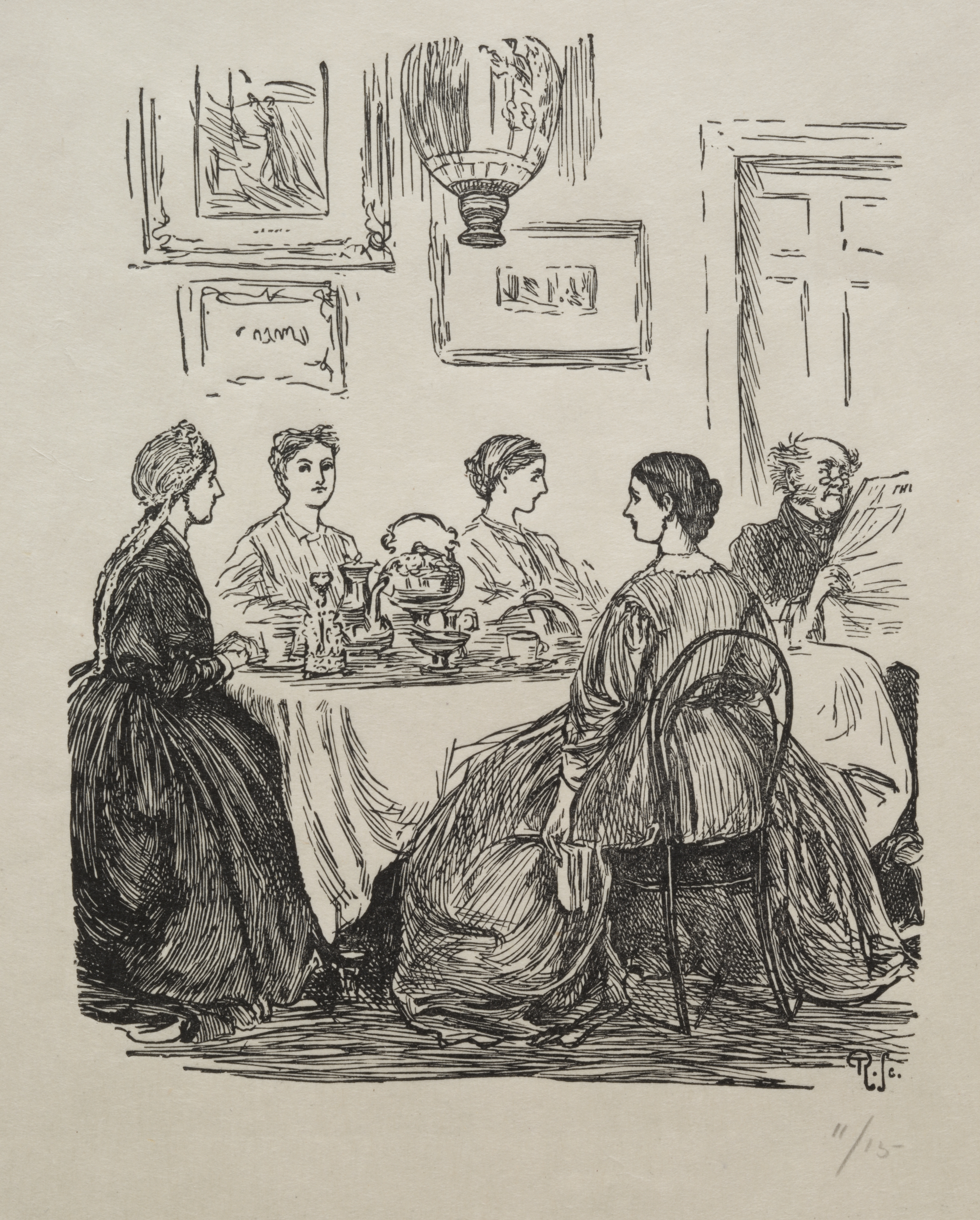 Black and white drawing of a group of people sitting around a table. The table is round and covered with a cloth. There are five people sitting around the table, all wearing old-fashioned clothing. A woman sits on the left side of the table in a dark dress. Across from her are two women. A man and woman sit on the right side of the table. The background shows a wall with two framed pictures and a vase. The room appears to have a door on the right side. The artist's signature is in the bottom-right corner. The title of the piece is "The Annual Question - Where Shall We Go?" and the artist is George Louis Palmella Busson Du Maurier.