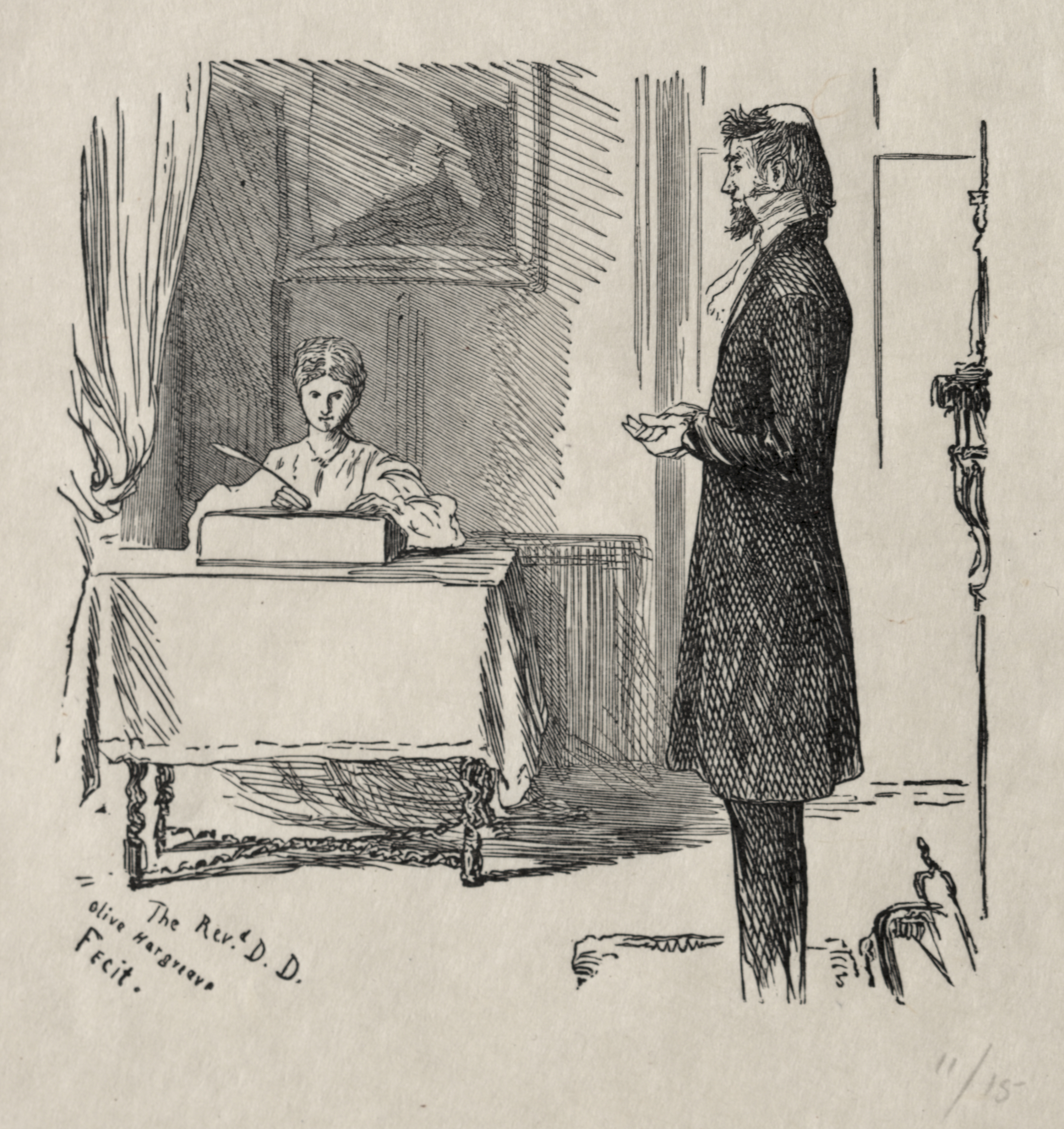 Black and white drawing of a man and woman indoors. The man stands on the right side. He faces left. He has short dark hair and a beard. He wears a dark suit with a vest and white shirt. His hands are in front of him. The woman sits on the left side behind a desk. She faces the man. She has light hair. She wears a high-necked puff-sleeved white blouse. Her left hand rests on a box on the desk. Her right hand holds a pen. The desk has a tablecloth with tassels on the ends. There is a curtain on the left. There is a doorway on the right. The image is signed in the lower-left corner. The text reads, "Olive Hargreave / The Rev. D.D. / Fecit."