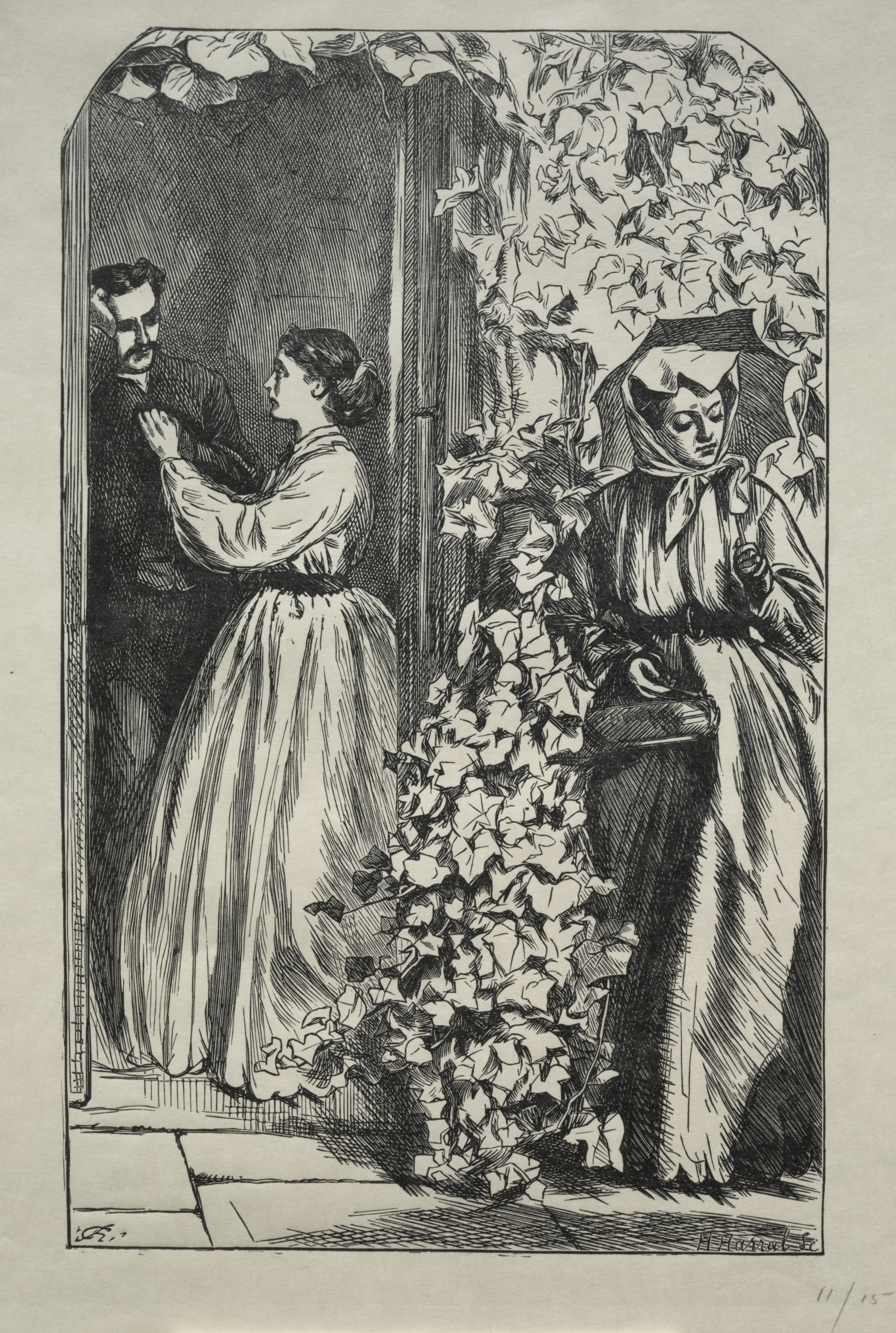 Black and white drawing of a woman standing outside doorway, left hand raised in a stopping motion towards a man on the left. She wears a long dress with puffy sleeves. A woman sits to the right, wearing a headscarf and facing forward with her hands crossed. A flowering plant fills the bottom center. The scene is framed with an arched top.