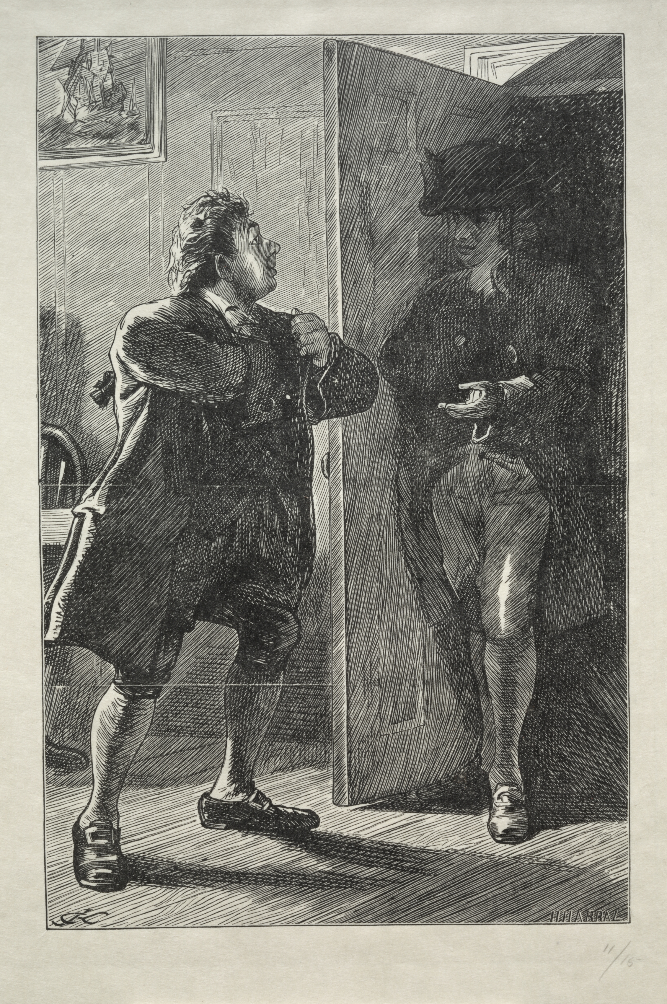 Black and white illustration of two men in old-fashioned clothing. The man on the left has curly hair, a dark coat with tails, knee-length pants, and white stockings. He wears black shoes with buckles and holds an object in his right hand. The man on the right wears a tricorn hat, a dark coat and pants. He holds an object in both hands. The scene is indoors with a picture on the wall, a chair and a door. The image is titled "An Actor's Holiday" and was created by Charles Samuel Keene.