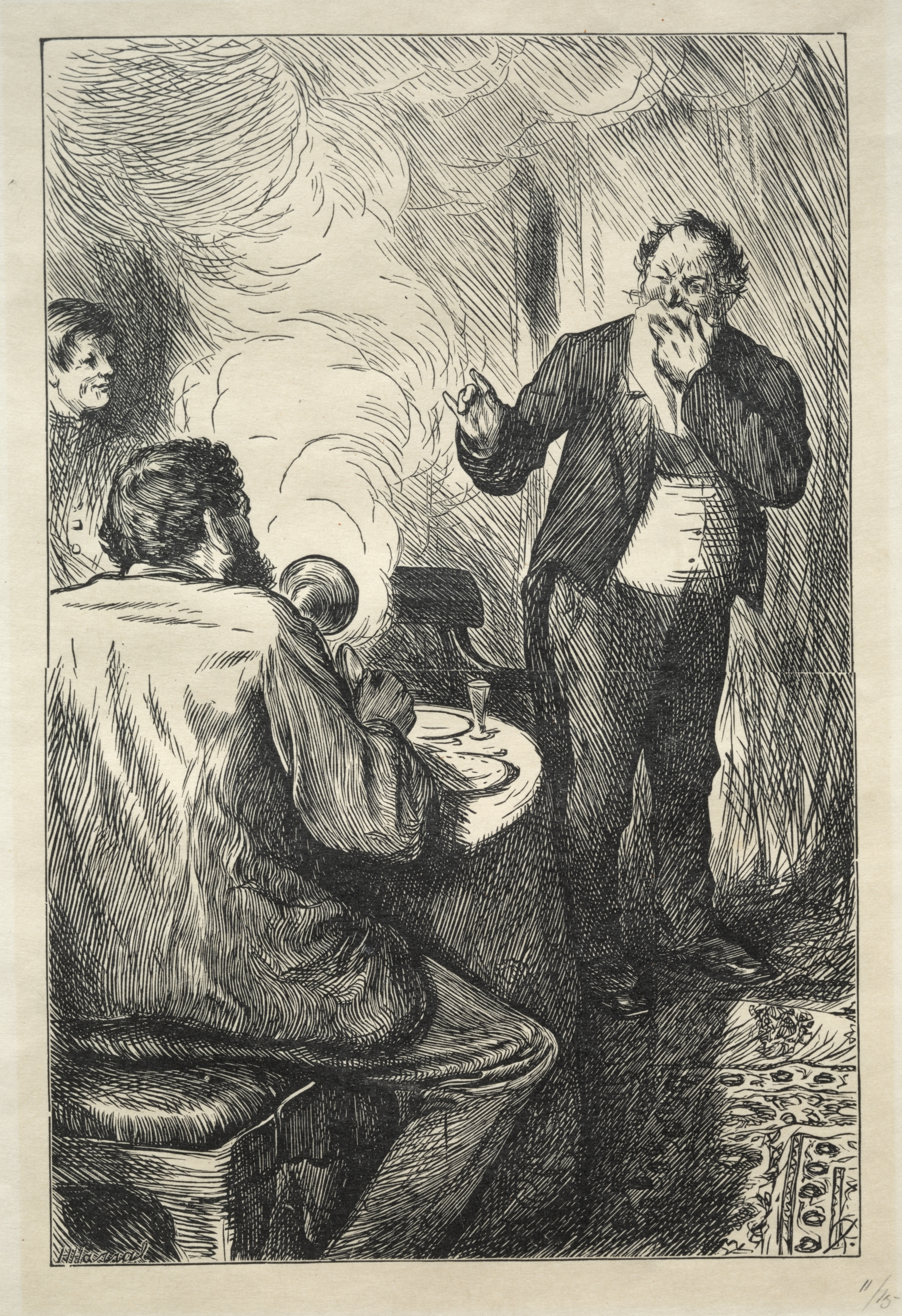 Black and white drawing of three men. A standing man with his finger to his mouth and a smoking pipe in his other hand next to a seated man smoking a pipe. A third man sitting on the left. The background depicts a wall and table with a glass on it. The image is titled "Smoking Strictly Prohibited" by Charles Samuel Keene.