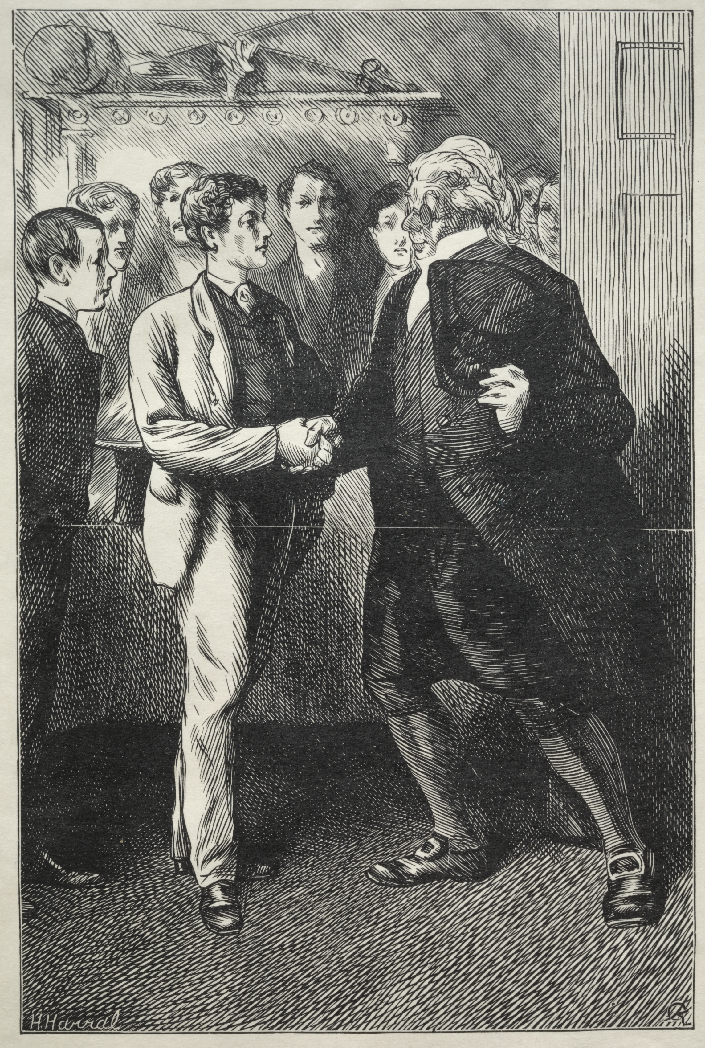 Black and white illustration of two men shaking hands. The man on the left has short, curly hair and wears a light-colored suit with a white shirt and black tie. The man on the right has white hair and wears a dark suit with a white shirt and stockings. Seven people stand behind them, looking on. A mantel with decorative items is visible in the background. The image is titled "Tomkin's Degree Supper and How it Ended" by Charles Samuel Keene.