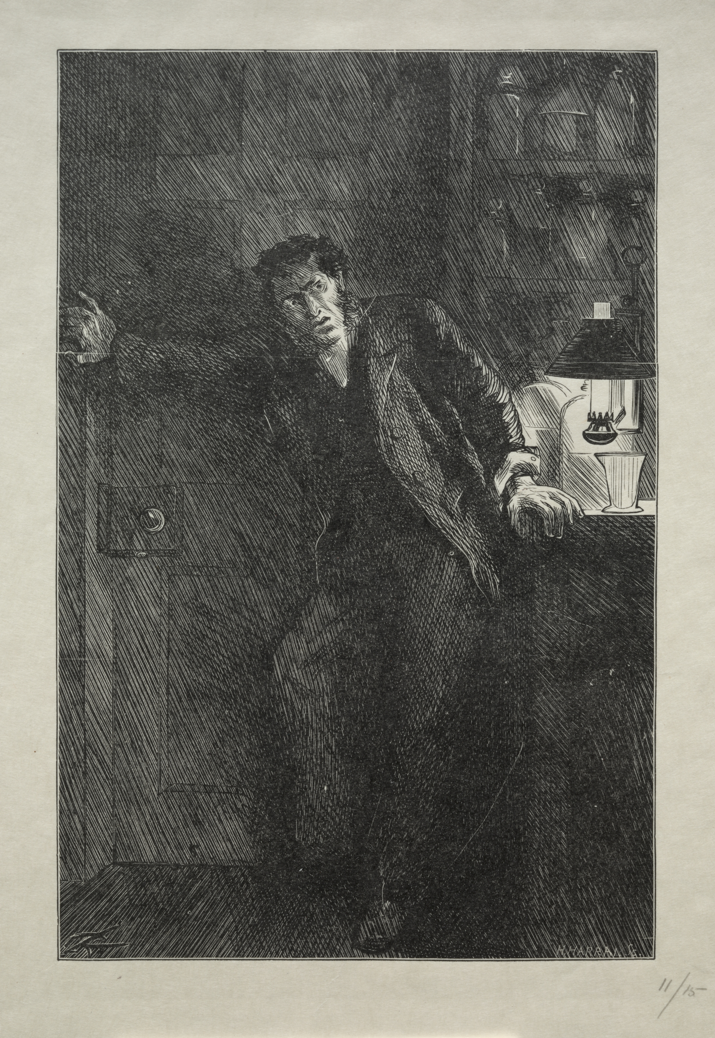 Black and white drawing of a man wearing a thick coat with fur lining, leaning on a table with one arm. The man has short, dark hair and is dressed in dark clothing. A door handle is on the left. The background shows a brick wall and shelves with objects on them. A lit lamp and a cup are on the table. The drawing style is detailed with heavy shading. The artist is Charles Samuel Keene, and the work is titled "The Coat with the Fur Lining".
