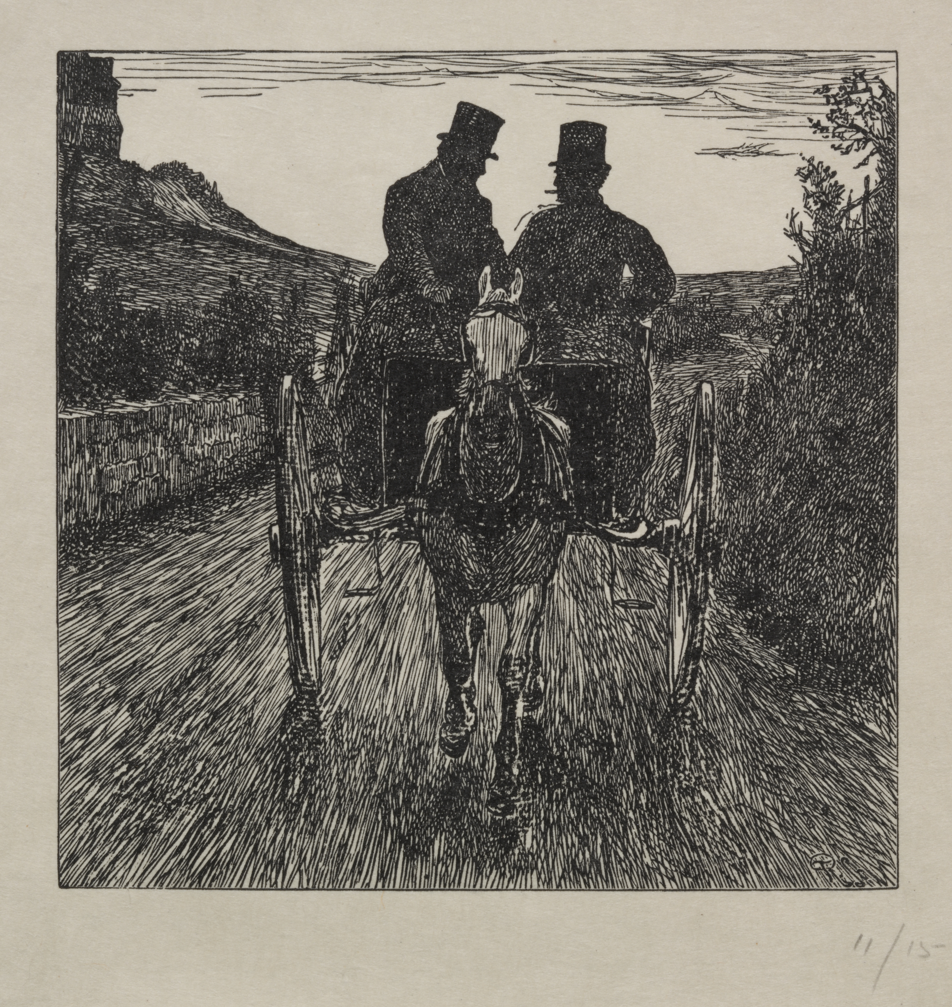 Black and white drawing of a horse-drawn carriage. Two men wearing top hats face away from viewer. Horse has ears perked up. Carriage on dirt road bordered by low stone wall and vegetation. Hilly background. Overcast sky.