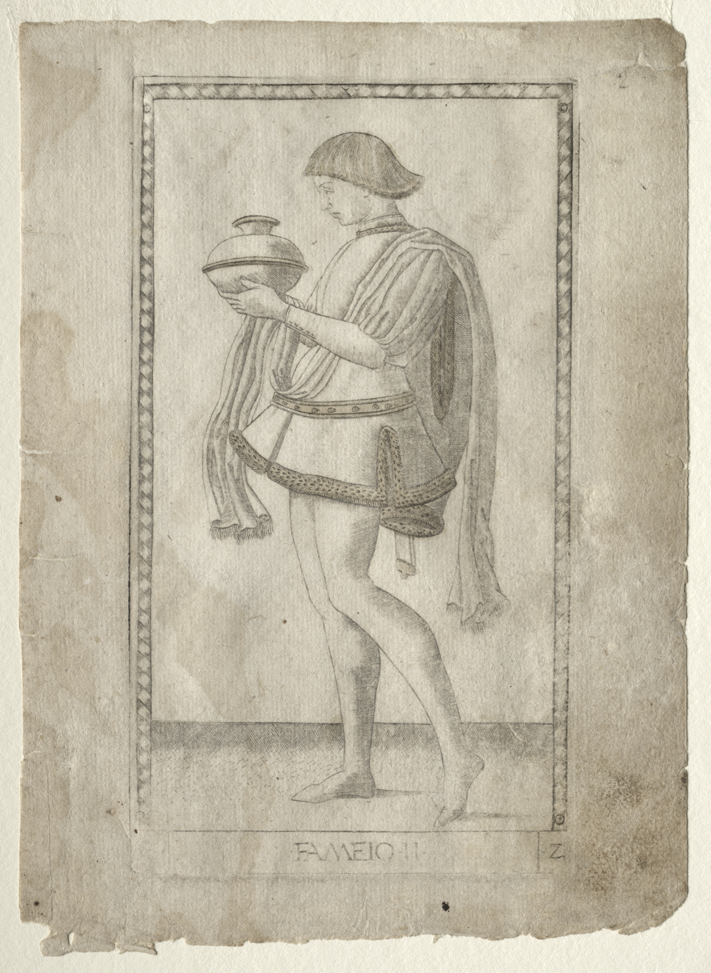 A man with bobbed hair wearing a short tunic and a long, folded cloth over his shoulder stands on tiptoe on the right side of the image. He is holding a pot with both hands. The background is a rectangle bordered with an interlocking chain design. The rectangle is on a piece of aged paper with darker spots and frayed edges. A block of text at the bottom of the rectangle reads "FAMEIO".