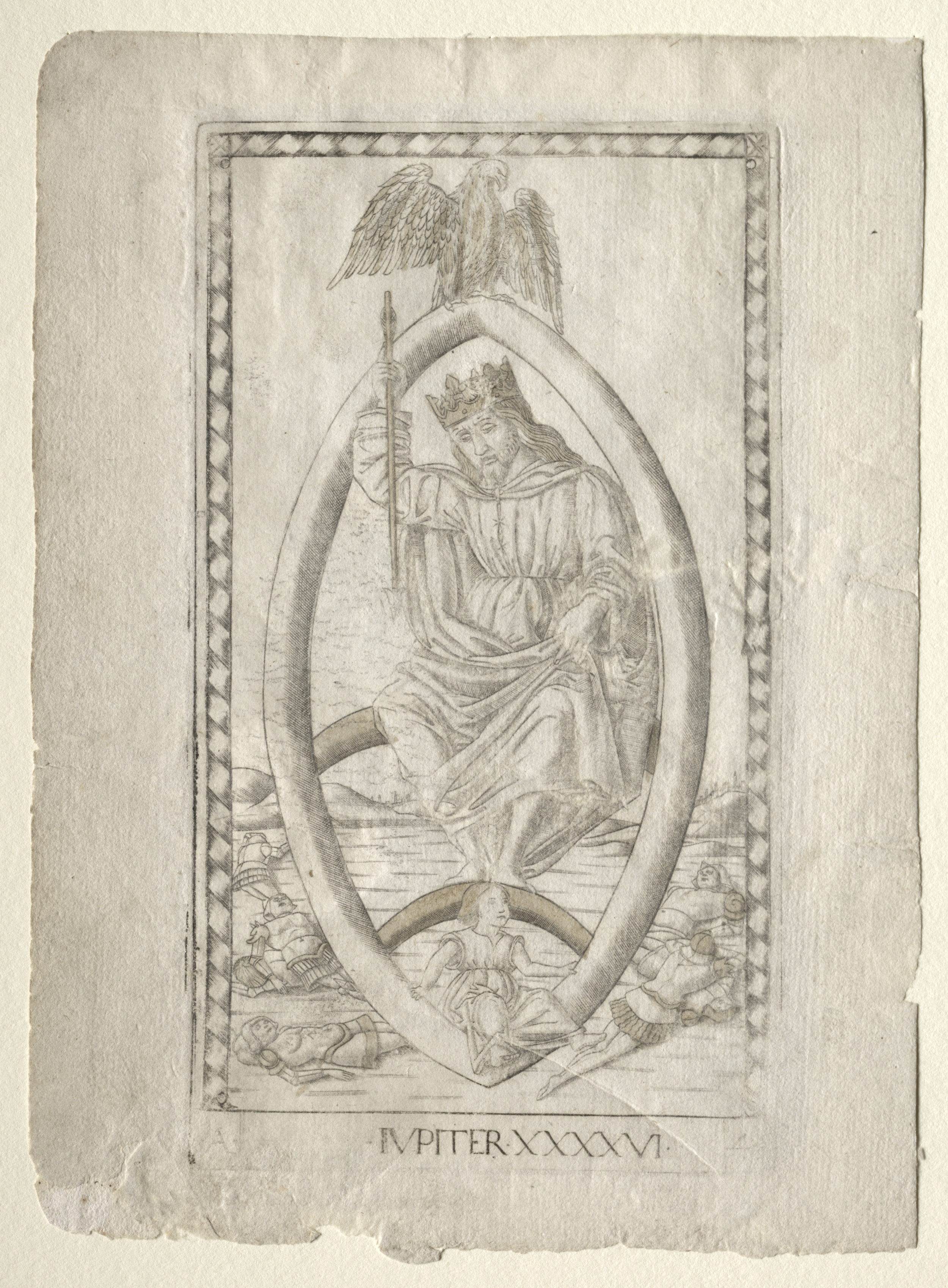 The image depicts a black and white drawing on aged paper. The drawing is framed by an oval shape with a pointed bottom. Inside the oval is a seated figure wearing a crown and a robe, holding a scepter in one hand. Two eagles are perched on top of the oval. The figure has long hair and sits on a surface with their left leg crossed over their right. The background of the drawing shows people lying on the ground. The drawing is bordered by a patterned frame. The word "JUPITER" is written in Latin letters at the bottom, accompanied by Roman numerals. The paper has rough edges and appears worn.