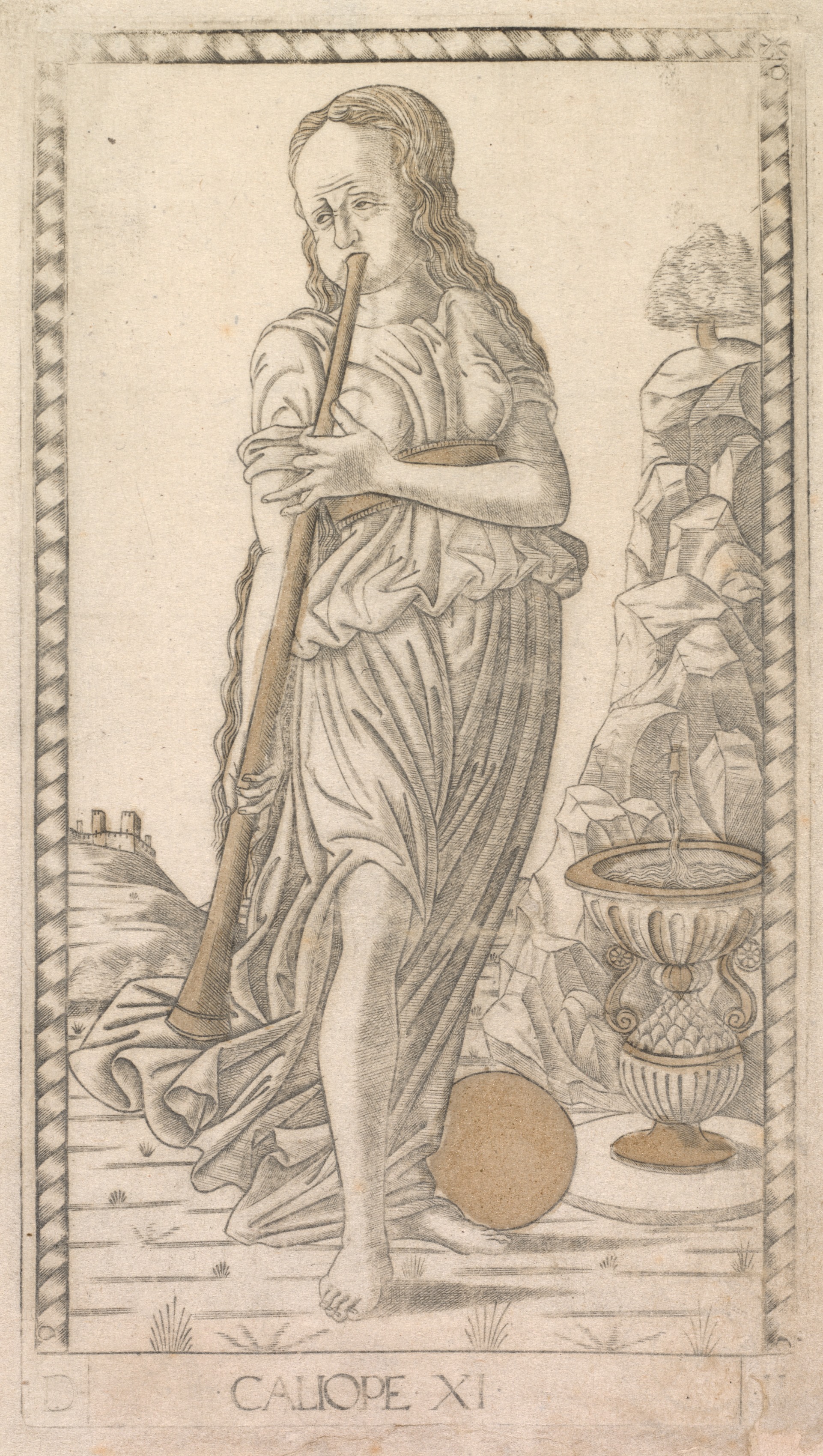 A woman with long wavy hair wearing a short sleeve top and a long skirt plays a long curved horn. She is barefoot and stands on a flat surface. A bowl on a stand with water flowing from it stands beside her to the right. A ball rests on the ground beside her. The background has a hill with a distant building on the left and a rocky formation with a tree on the right. Text along the bottom reads "Calliope XI." The image includes a border.