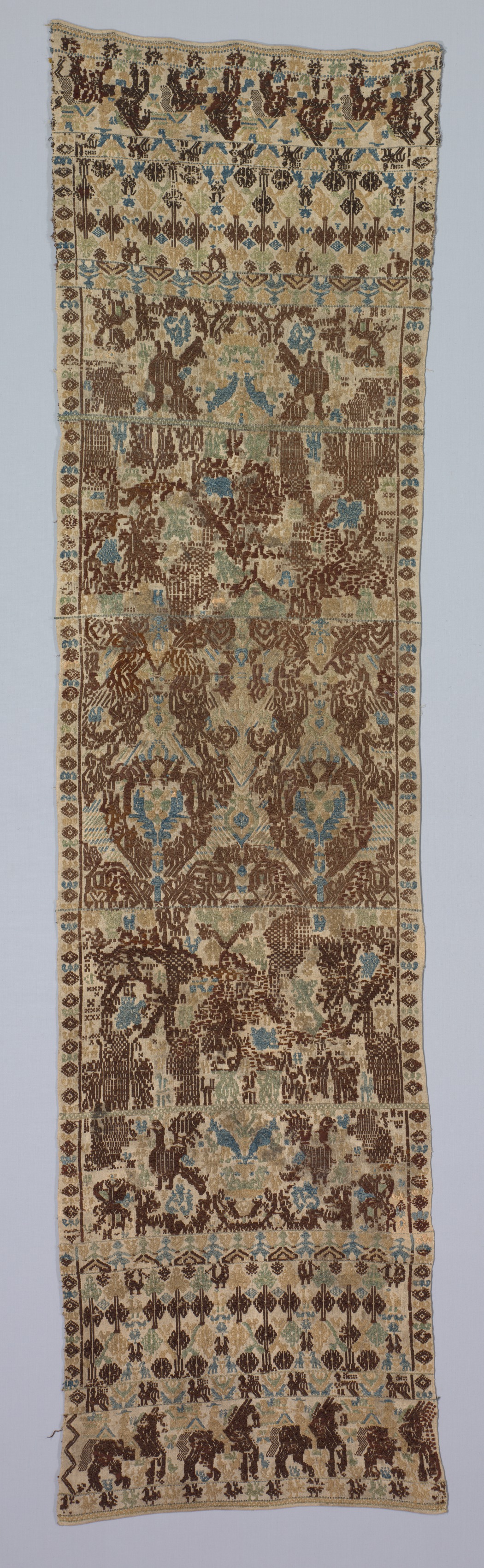 The title of the image is "Saddle Cloth". Long, narrow textile with a beige background and a pattern of brown and blue designs. The textile has a border around the edges with small, repeating shapes. The main body of the textile features a series of sections with different patterns, including geometric shapes, animals, and foliage. The top section has a row of abstract shapes, while the lower sections have more intricate designs featuring horses and other animals. The colors used are primarily beige, brown, and blue. The textile appears to be made of fabric and has a worn, aged appearance.
