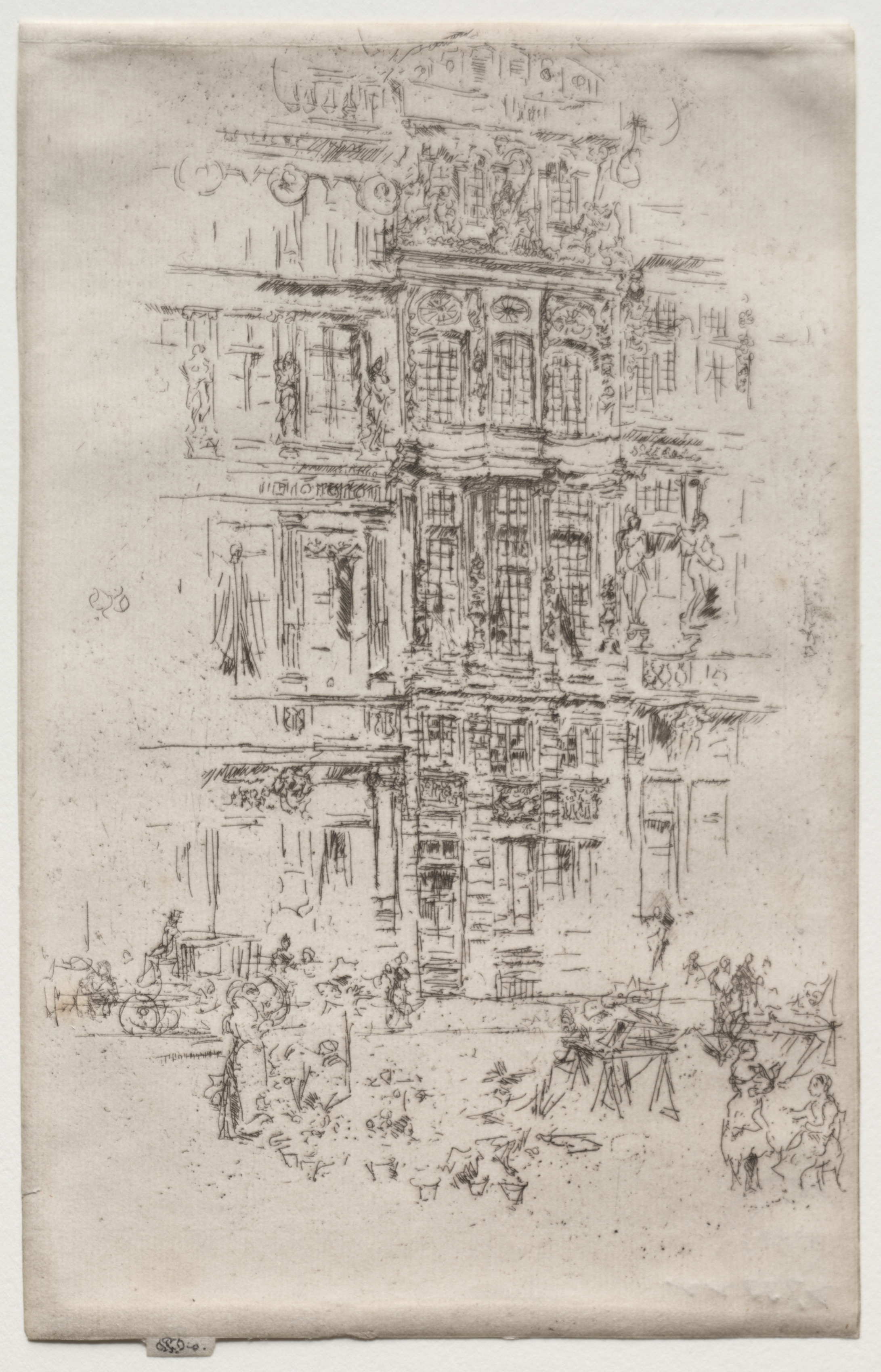 The image depicts a large, ornate building with three visible floors, each featuring multiple windows and balconies. The building's facade is adorned with intricate details, including carvings and statues. In the foreground, people are shown going about their daily activities, with some standing near market stalls. The image is rendered in black and white, with a range of shading and lines used to create depth and texture. The artwork appears to be an etching or drypoint print, with a light-colored background and darker lines. The overall atmosphere suggests a bustling urban scene, likely set in Brussels, as indicated by the title. The artist's use of fine lines and delicate details adds to the sense of realism and captures the essence of city life.