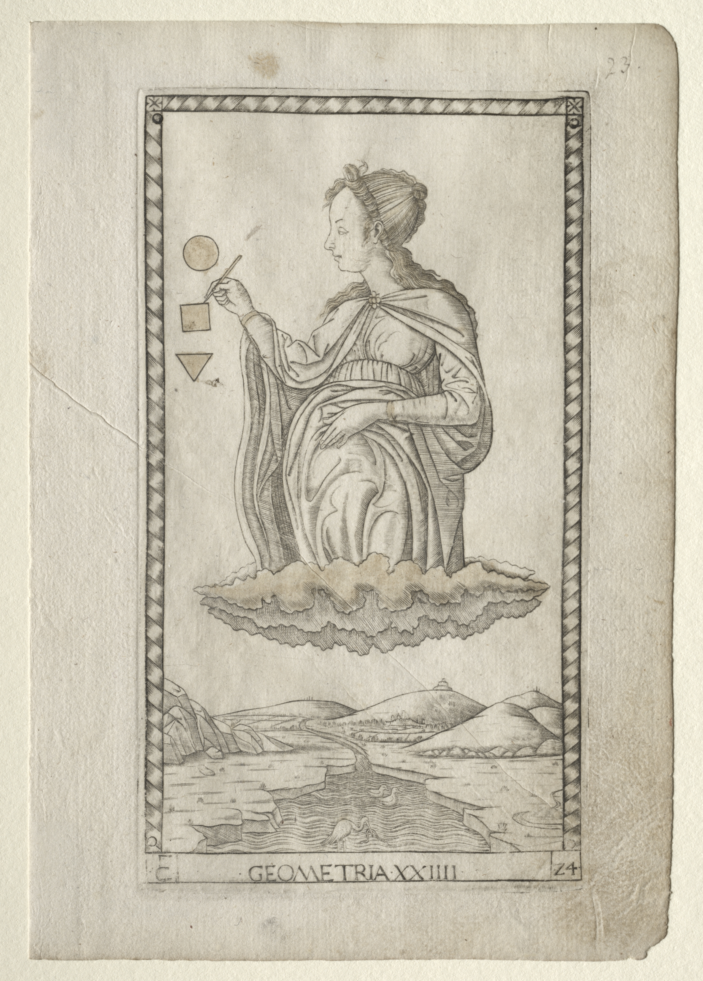 A woman sits on a cloud, holding a stick with a circle on the end. She wears a dress and shawl. The woman's hair is pulled back. She holds three shapes in her left hand: a circle, square and triangle. The background shows a landscape with hills and water. The artwork is in a rectangular frame with a border. The frame sits on a beige background. The bottom of the frame has Latin text: "GEOMETRIA XXIII". The number "24" appears in the lower right corner of the frame.