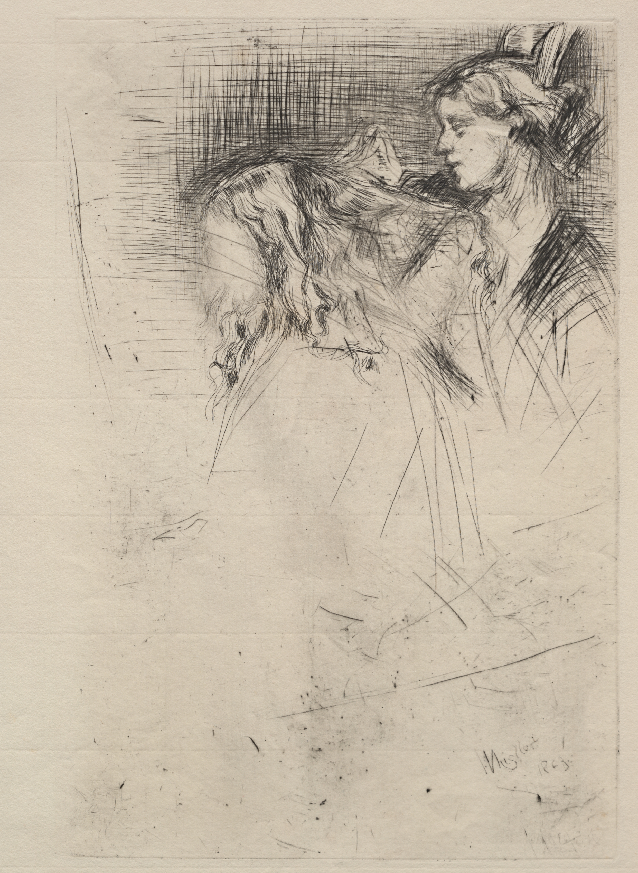 The Toilet by James McNeill Whistler. A woman with long hair sits with her head turned to the left. Her hair falls to her chest. A portion of her right shoulder and chest are visible, with a dark colored garment on. The image is a sketch with black lines on beige paper. The artist's signature appears in the lower right.