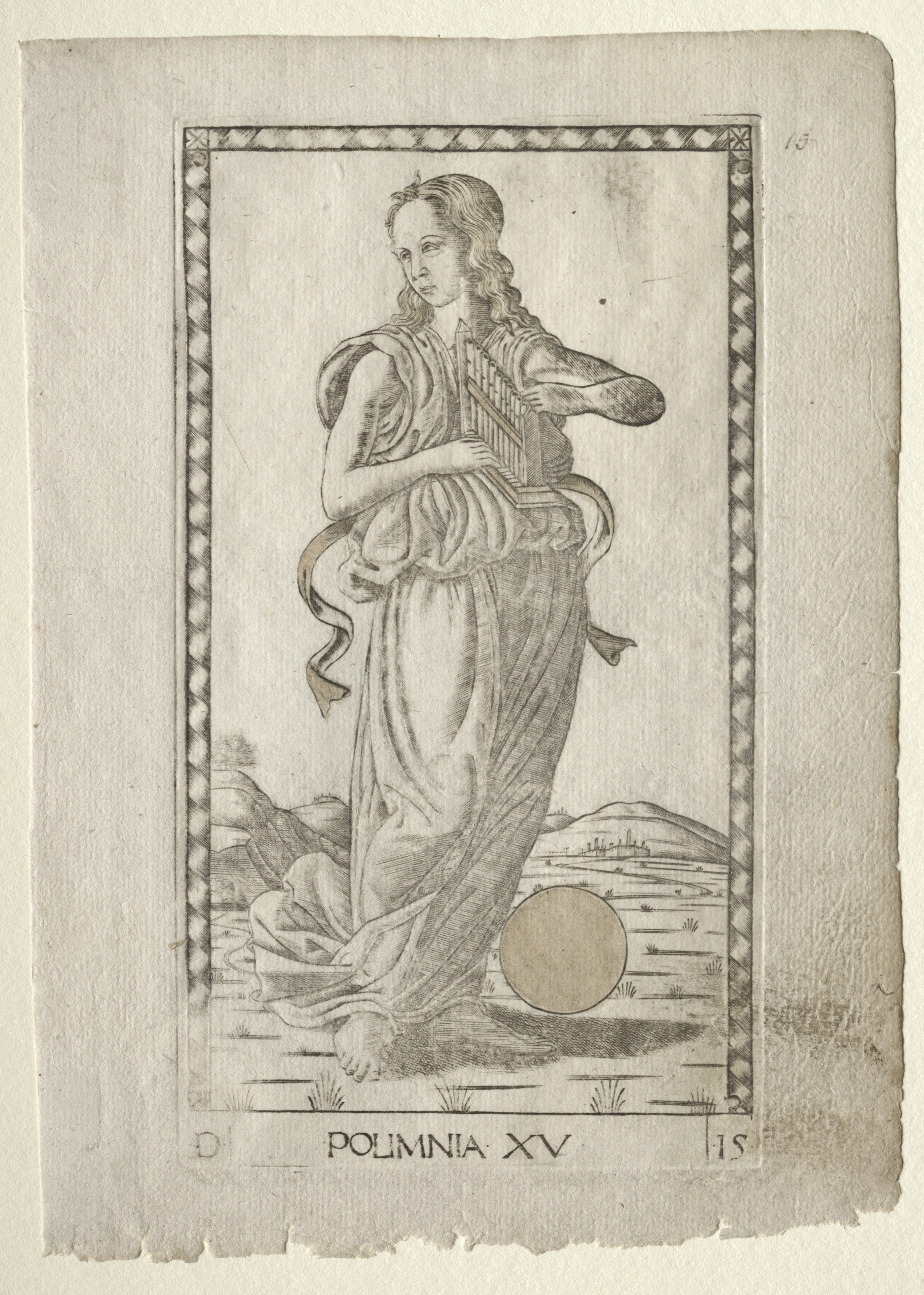 A woman with long wavy hair, wearing a long dress and puffy shoulder pieces, standing and playing a harp. A ball on the ground next to her. A distant mountainous landscape. Border around the drawing with a decorative edge. Text at bottom reads "POLIMNIA XV". Image is in black and white.