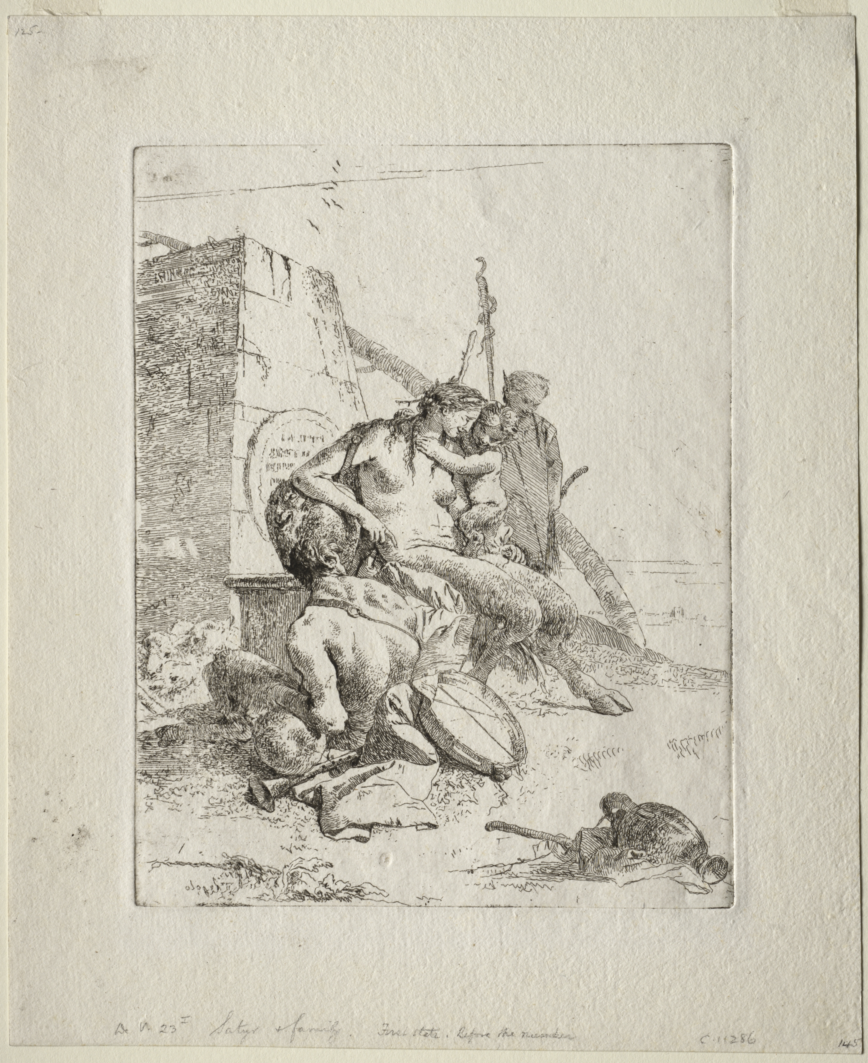 Black and white drawing on off-white background. A satyr sitting on a rock with a baby on his lap and another on his back. He holds a staff in one hand. A dog lies on the ground in front of him. To the left, a wall with a stone slab embedded in it; the slab bears an inscription. A pile of animal skulls to the left. A nude baby on the ground to the left. A cityscape visible in the background.