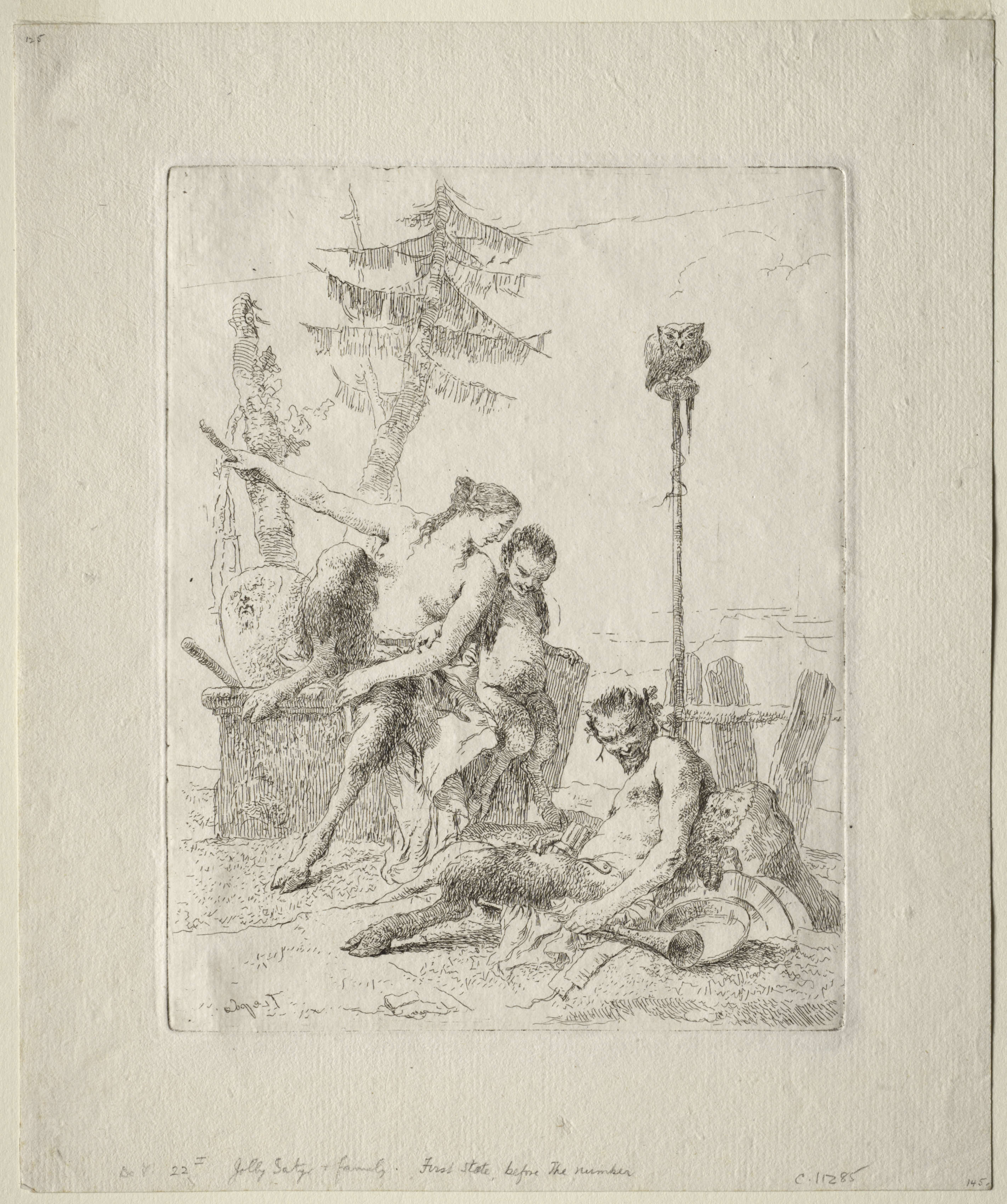 The image depicts a black and white drawing of a scene with several figures. A satyr with horns and goat-like legs sits on a stone block with a nude woman and child. A second satyr sits on the ground to their right with a large dead bird. A tree and a pole with an owl are to their left. There are decorative elements on a pole in the background. The entire drawing is on a thick off-white background. The scene includes several nude human and human-like figures.