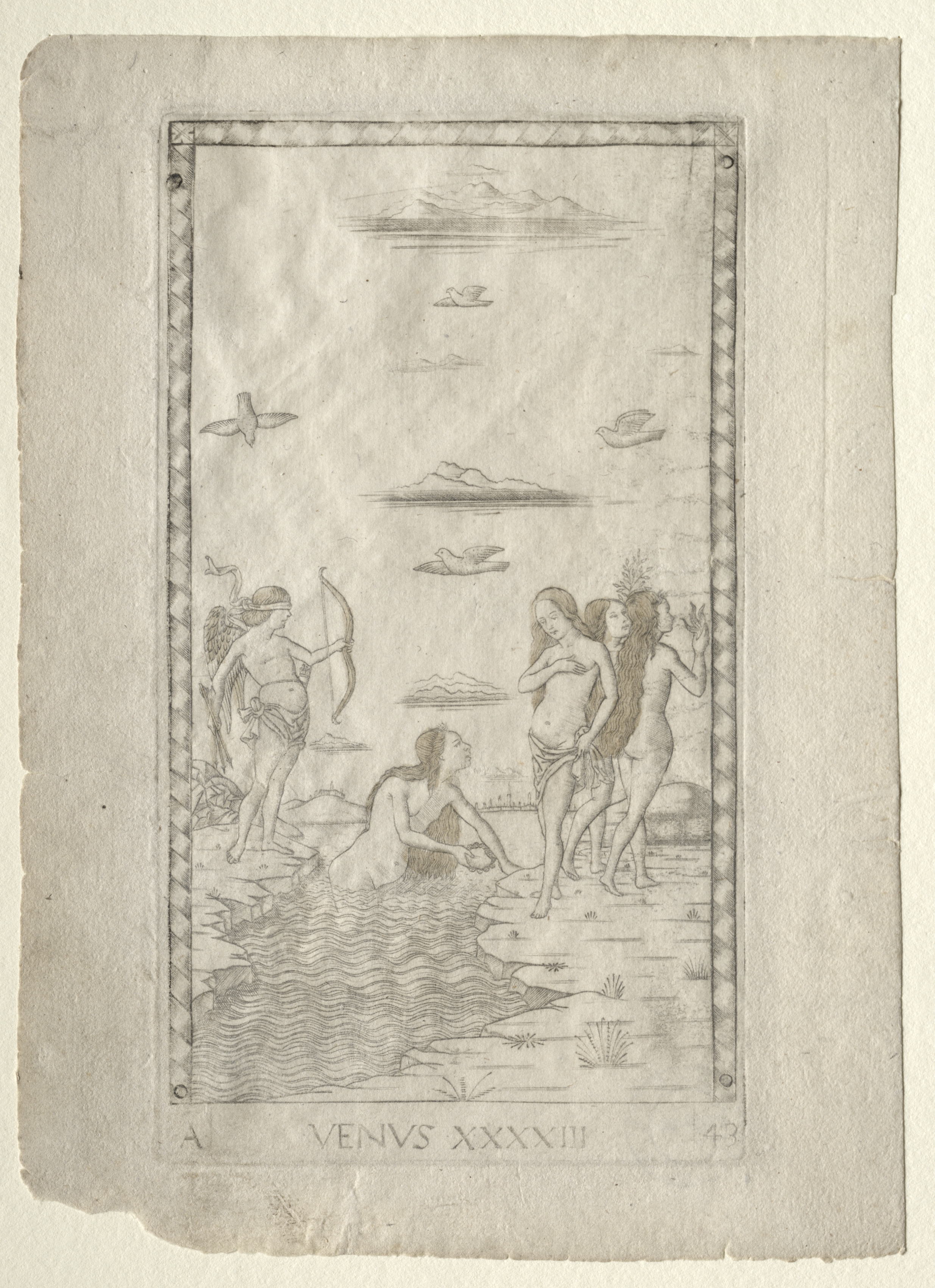 A black and white drawing on aged paper depicting a scene with a border. The drawing shows a group of five people, four women and one man are semi-nude. A woman on the left holds a bow and has wings. Four of the people are standing on land and one woman is sitting in water. The background shows a sky with clouds and a mountain range in the distance. The border around the drawing has a rope-like design. At the bottom of the drawing, there is a line of text that reads "VENVS XXXXIII" in Roman numerals.