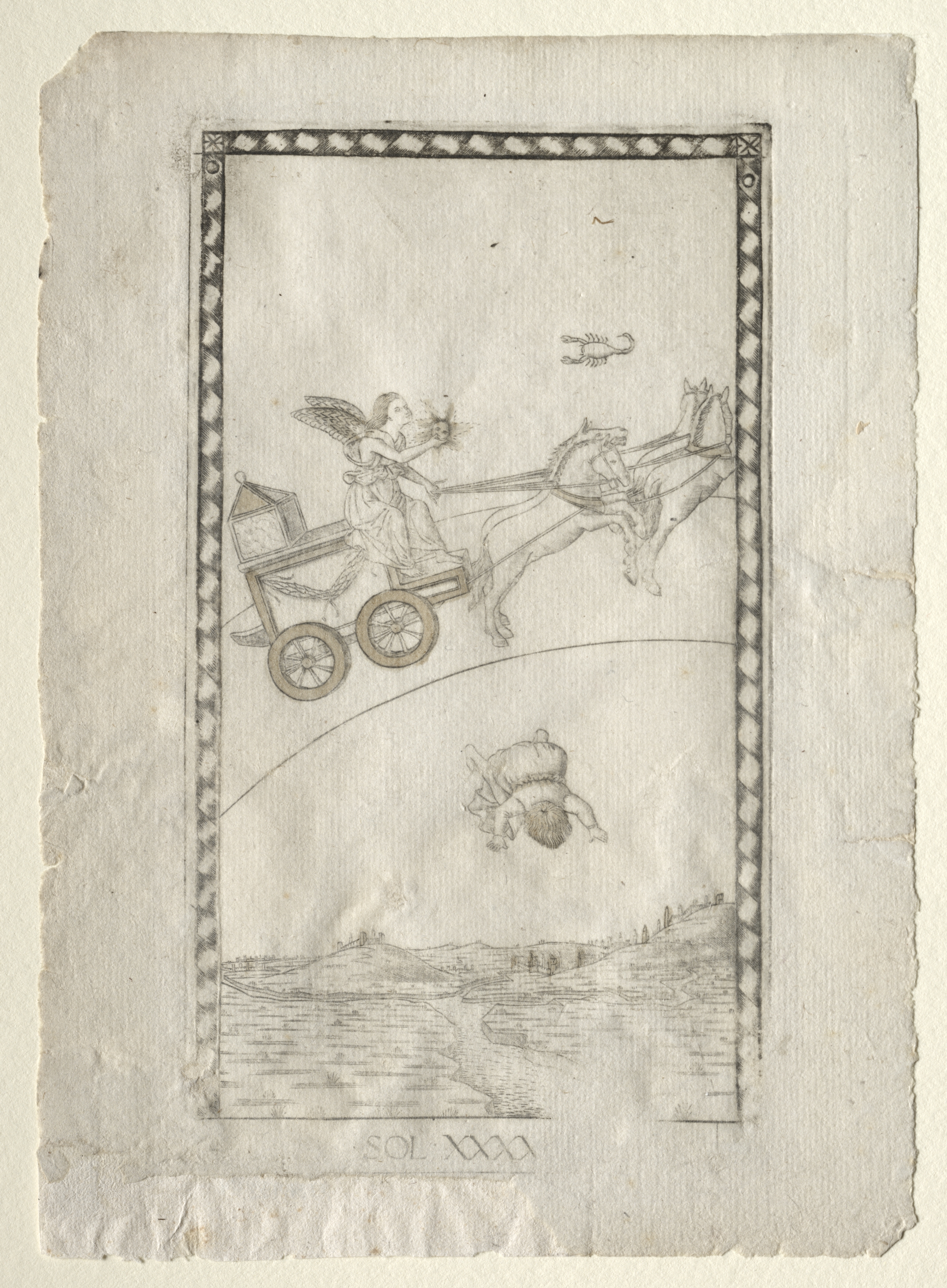 Black and white drawing on aged paper. A rectangular drawing with a decorative border. Inside the drawing, an angel in a chariot pulled by four horses. The chariot and angel are flying above a globe-like earth. The earth has a man falling off it. In the sky near the chariot, a scorpion. The text "SOL" is written at the bottom of the drawing. The paper is a light beige color with rough edges.