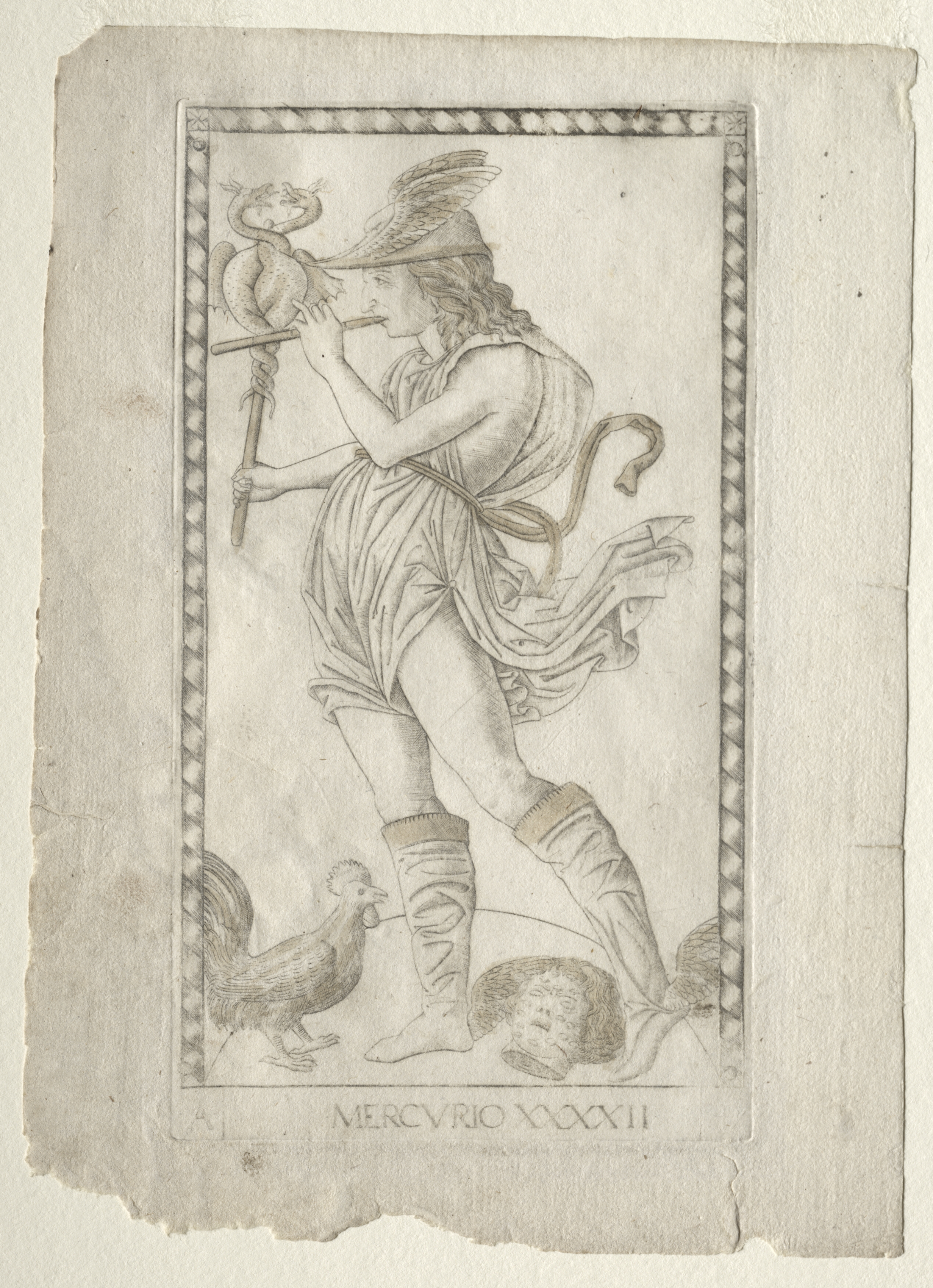 A drawing depicts a man in a short tunic and knee-high boots, with long hair. He wears a hat with wings on top and holds a staff with a snake wrapped around it in his right hand and a flute in his left. A snake is on the ground beside his right leg. A rooster and a human head are beside his left leg. He stands within a rope-twist border. The text at the bottom reads "MERCURIO XXXII". The drawing is on a piece of beige paper with rough edges.