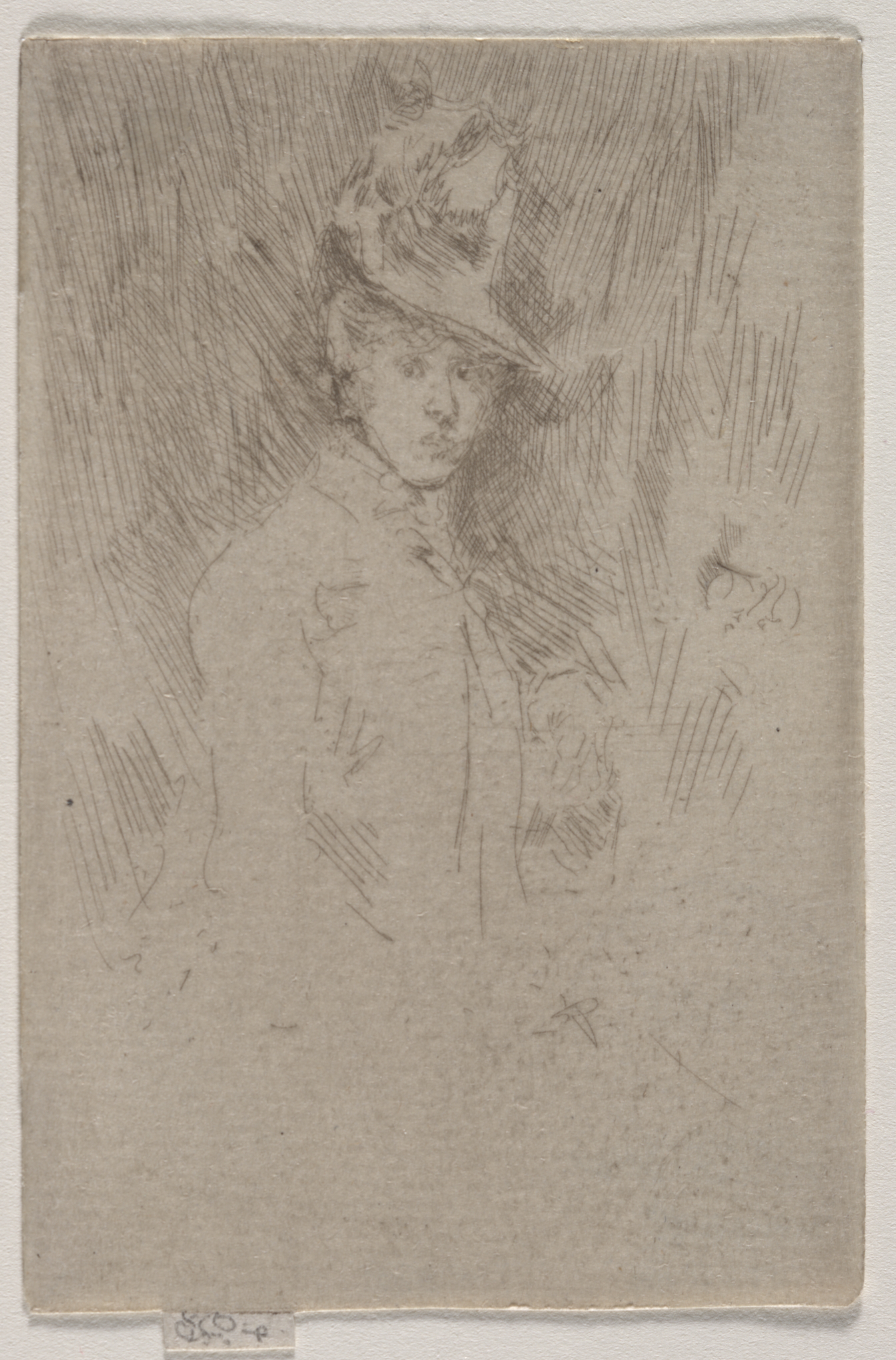The Little Hat by James McNeill Whistler: A sketch of a woman wearing a hat, with her body facing left and head turned right, looking straight ahead. Her face is in sharp focus, while her body is less detailed. She wears a hat adorned with a bow at the front and a feather on the right side. Her attire includes a collared jacket or coat. The background consists of intersecting diagonal lines. The image is rendered in shades of gray on a rectangular piece of paper with rough edges.