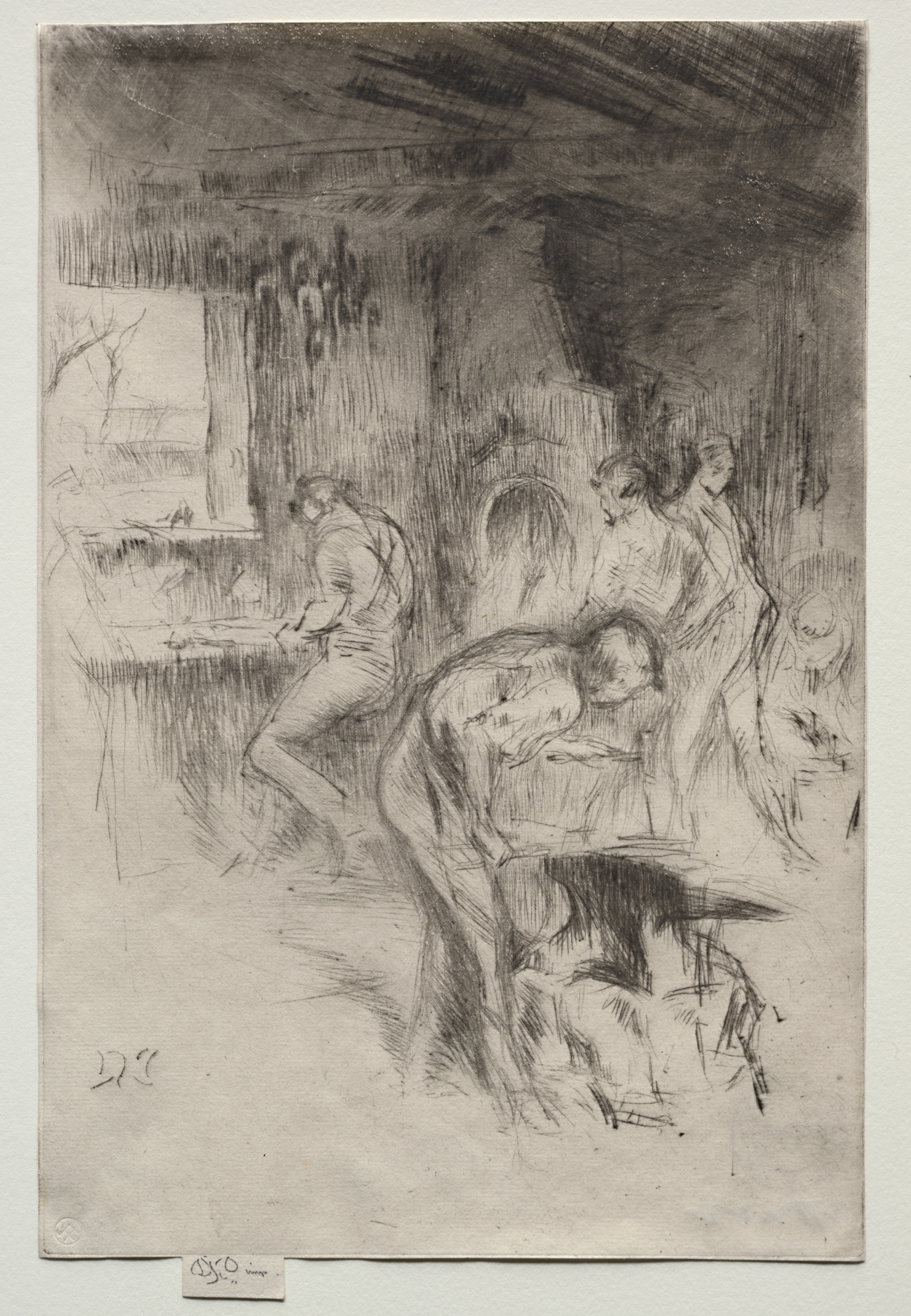 The Little Forge by James McNeill Whistler: A black and white sketch depicting a scene inside a forge. The image shows a group of people working. In the foreground, a man is hunched over with his head down. Behind him, another man stands facing to the left. On the left side, a man stands by a table. The background includes a window on the left and a vaulted ceiling. The overall atmosphere appears dimly lit.
