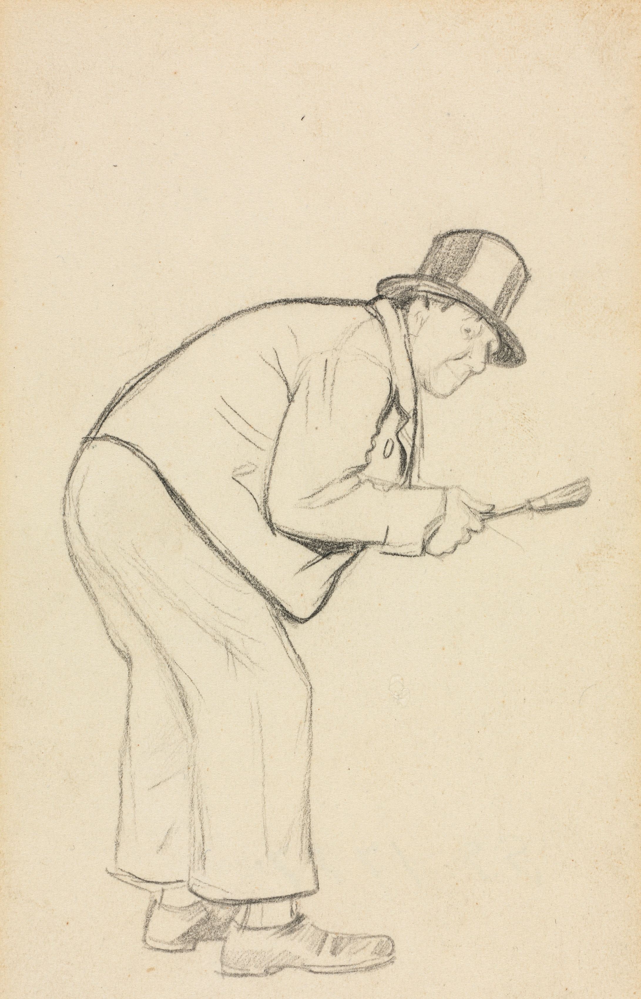 A pencil drawing on tan paper of a man in a suit and bowler hat leaning forward. The man is wearing a light-colored suit jacket and pants with a vest. The man is wearing shoes that appear to be dress shoes. The man has his head tilted down. The man is holding a brush in both hands. The brush appears to be large with long bristles. The man is leaning forward at the waist, with his back arched. The background of the drawing is plain and tan.