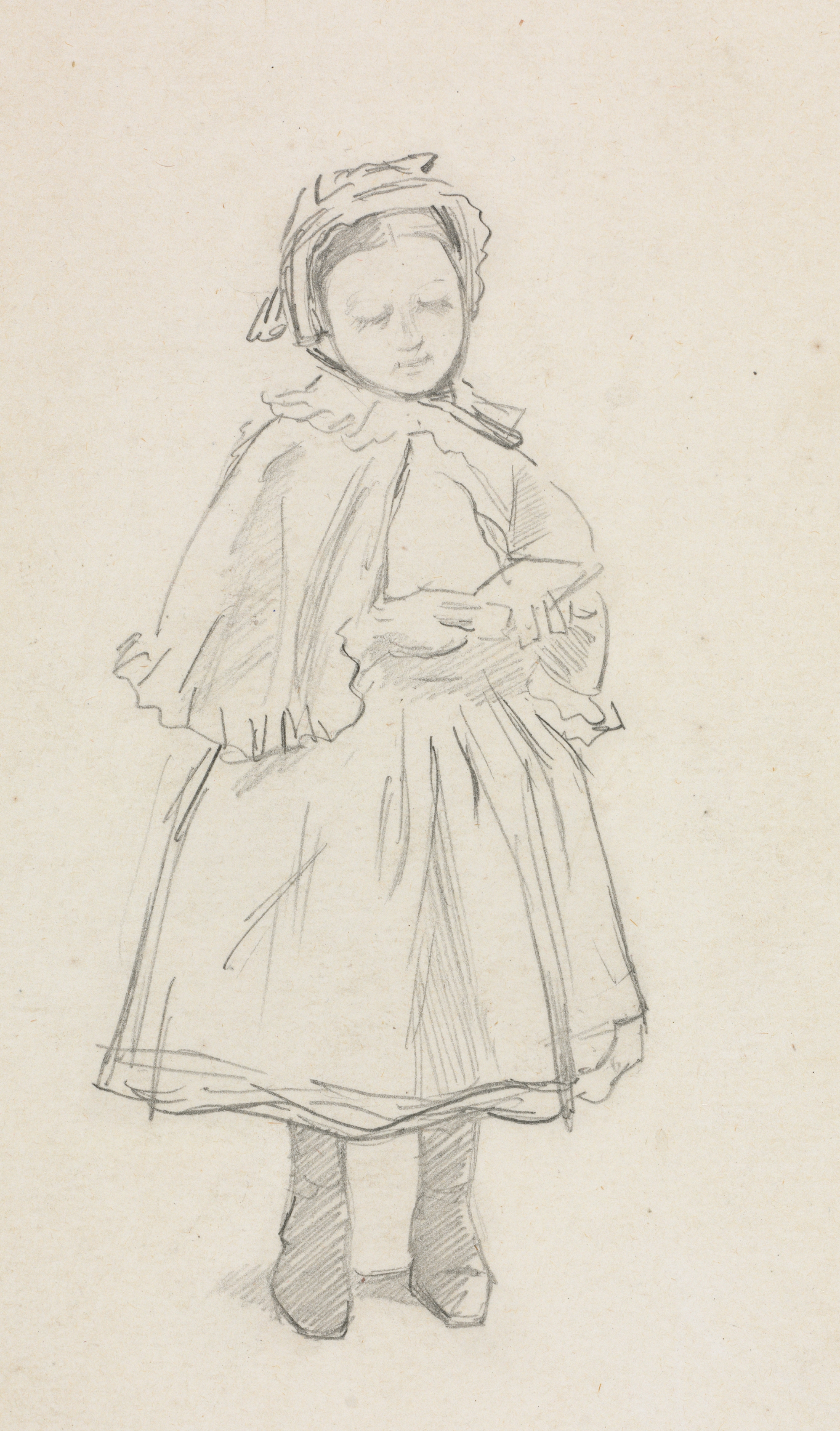 A standing young girl drawn in pencil on beige paper, viewed from the front. The girl wears a long dress with a fitted bodice and a full skirt. The sleeves of the dress are puffed at the top and taper down. A shawl or cape covers her shoulders. Her legs are covered by dark stockings. She wears a close-fitting hat or headscarf that covers her hair. Her hands are clasped in front of her. Her eyes are cast downward. The drawing appears to be a study or sketch. Charles Samuel Keene, Study for a Little Girl.